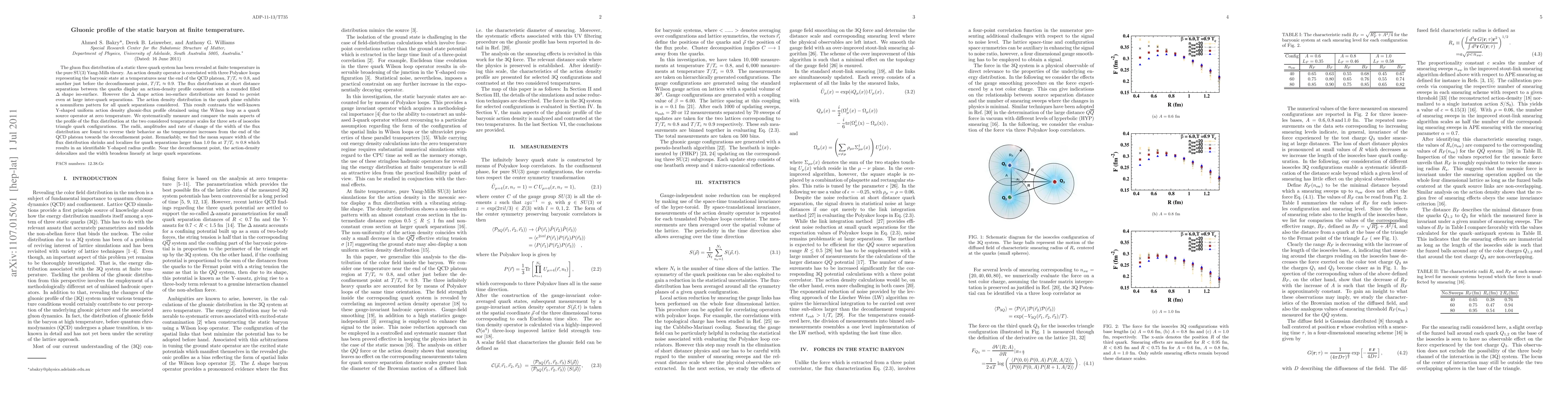 This study reveals the gluon flux distribution of a static three-quark system at finite temperatures near the QCD plateau (T/T_c = 0.8) and just before deconfinement (T/c = 0.9). Despite increased inter-quark separations, a Delta-shaped action iso-surface persists. The action density distribution in the quark plane shows nonuniform patterns, contrasting with the zero-temperature Y-shaped profile. Key findings include reversals in radii, amplitudes, and width changes of the flux distribution as temperature increases from the QCD plateau to deconfinement, with the flux distribution localizing at larger separations at T/T_c = 0.8 and delocalizing near the deconfinement point.