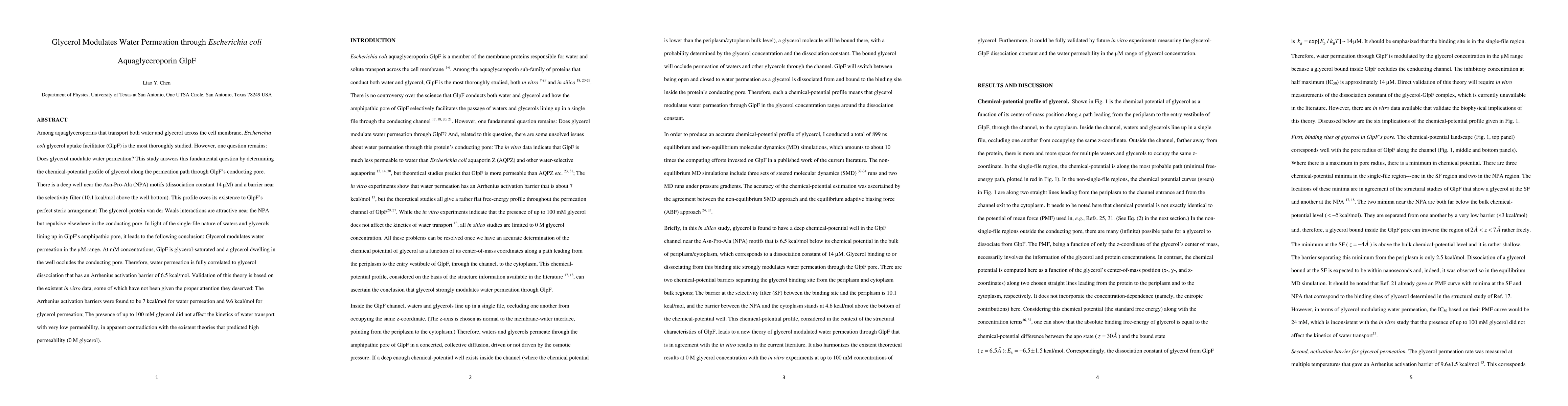 This study investigates whether glycerol modulates water permeation through Escherichia coli's aquaglyceroporin GlpF, finding that glycerol's chemical-potential profile along the pore indicates modulation in the microM range. At higher concentrations, glycerol saturation occludes the pore, fully correlating water permeation with glycerol dissociation.