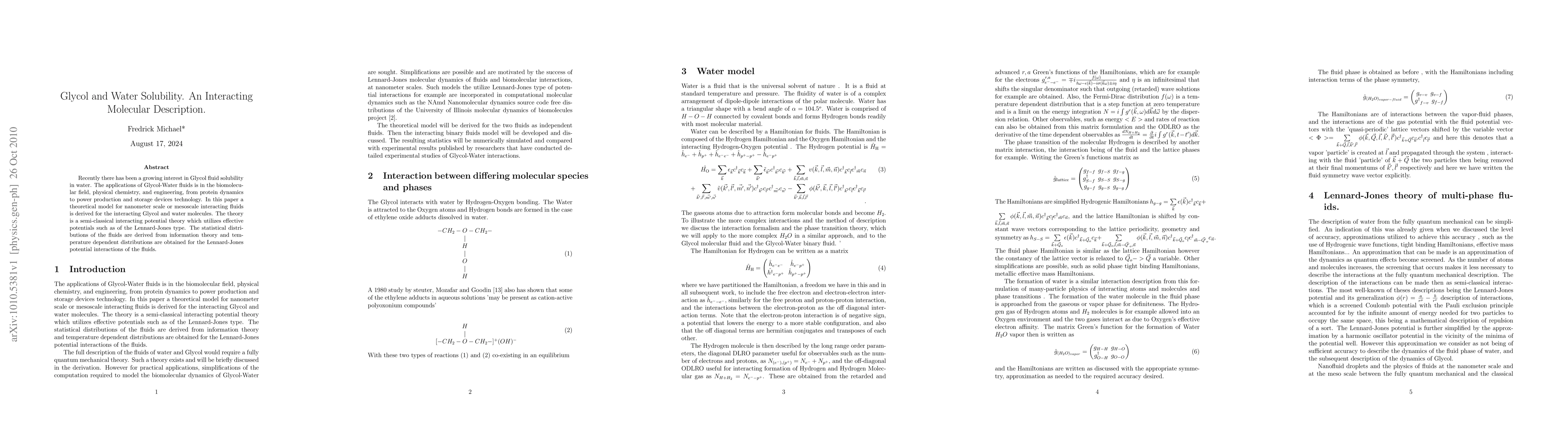 Recently there has been great interest in Glycol-Water chemistry and solubility and temperature dependent phase dynamics. The Glycol-Water biochemistry of interactions is present in plant biology and chemistry, is of great interest to chemical engineers and biochemists as it is a paradigm of Carbon-Hydrogen Water organic chemistry. There is an interest moreover in formulating a simpler theory and computation model for the Glycol-Water interaction and phase dynamics, that is not fully quantum mechanical yet has the high accuracy available from a fully quantum mechanical theory of phase transitions of fluids and Fermi systems. Along these lines of research interest we have derived a Lennard-Jones -like theory of interacting molecules-Water in a dissolved adducts of Glycol-Water system interacting by Hydrogen bonds whose validity is supported at the scale of interactions by other independent molecular dynamics investigations that utilize force fields dependent on their experimental fittings to the Lennard-Jones potential and where we have relaxed or generalized the potential to arbitrary and possibly fractional powers. The theory then is a semi-classical theory as the repulsion of particles is incorporated in the Lennard-Jones -like potential's energy required to bring two molecules together, a repulsion of sorts. We derive distributions for the molecular species that are exactly solved, and are derived from maximum entropy, here the semi-classical analogue of the Hamiltonian superposition of quantum phase theory of fluids. We also derive the similar statistics from the microscopic SDEs stochastic differential dynamics equations, verifying the macroscopic state function entropic-thermodynamic derivation.