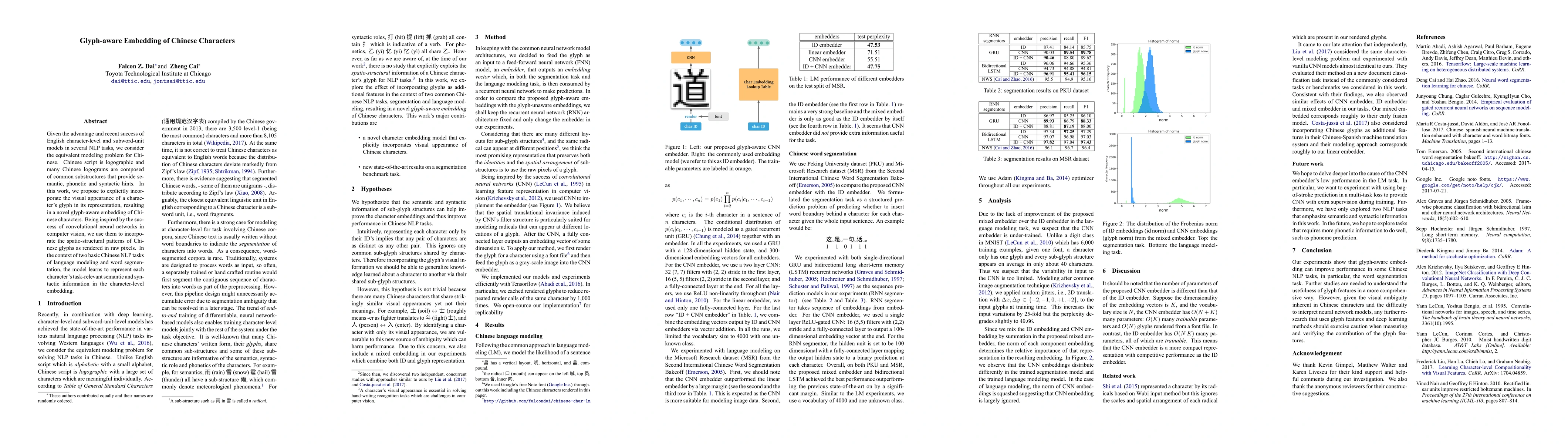 This paper proposes a novel glyph-aware embedding for Chinese characters that incorporates the visual appearance of characters using convolutional neural networks to capture spatio-structural patterns. The model aims to enhance Chinese NLP tasks like language modeling and word segmentation by integrating semantic and syntactic information from character glyphs.