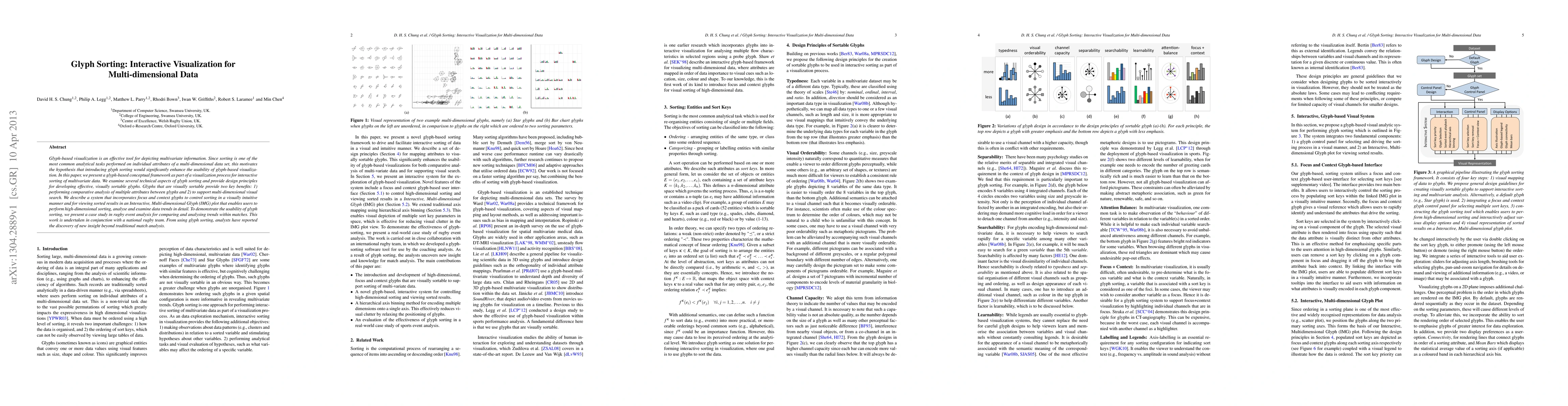 This paper introduces a conceptual framework for glyph-based visualization that enables interactive sorting of multivariate data, enhancing comparative analysis and multi-dimensional visual search. The system demonstrates usability through a case study in rugby event analysis, revealing new insights beyond traditional methods.