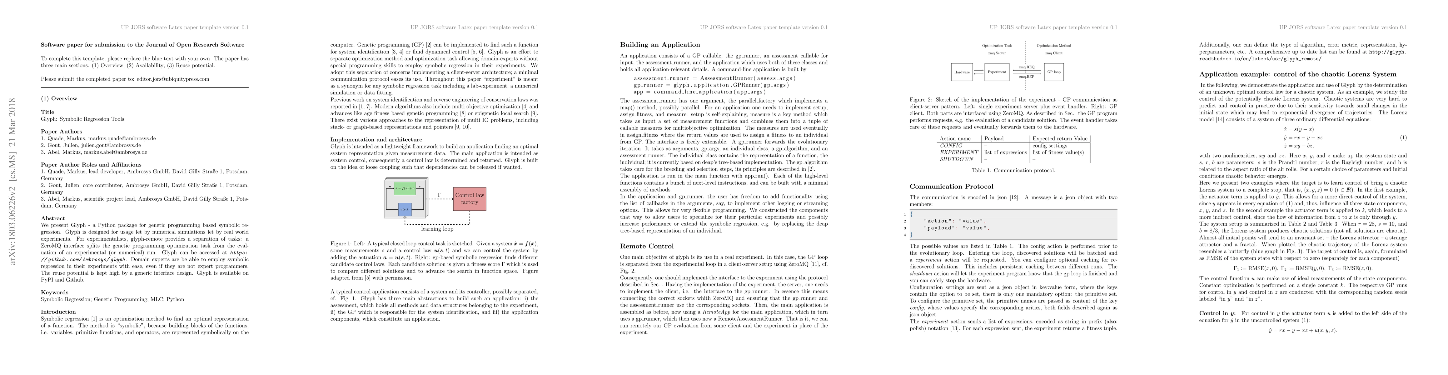 Glyph is a Python package for genetic programming based symbolic regression that allows domain experts to easily employ symbolic regression in their experiments without needing to write code. It provides a generic interface design with reuse potential, making it accessible to non-expert programmers.