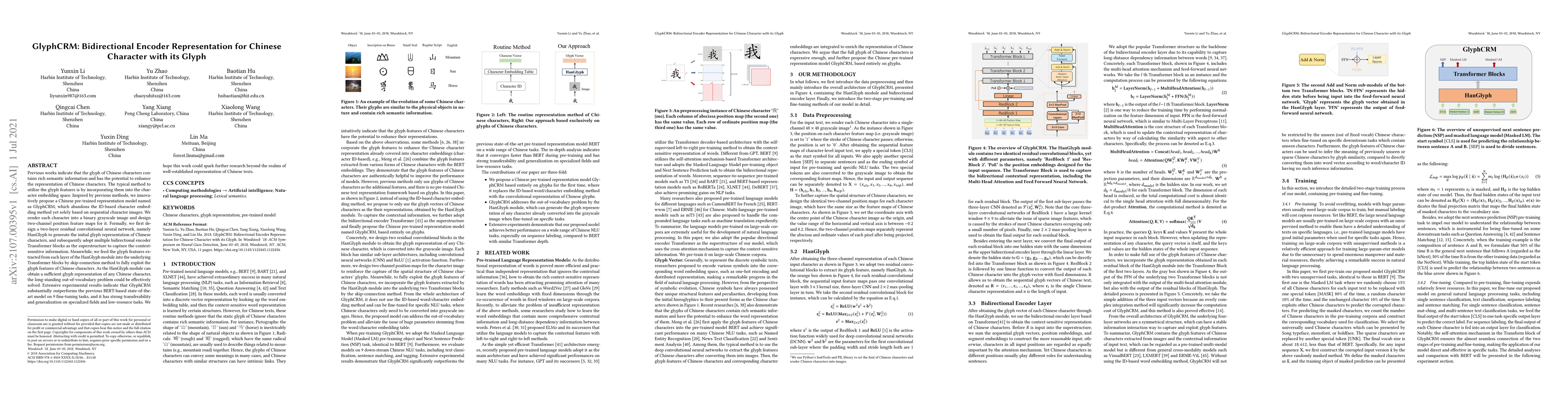 GlyphCRM leverages sequential character images and glyph features to create a pre-trained representation model for Chinese characters, outperforming previous BERT-based models on various tasks and addressing the out-of-vocabulary problem. The model uses a HanGlyph module and Transformer blocks to capture context-sensitive information and fully exploit glyph features.