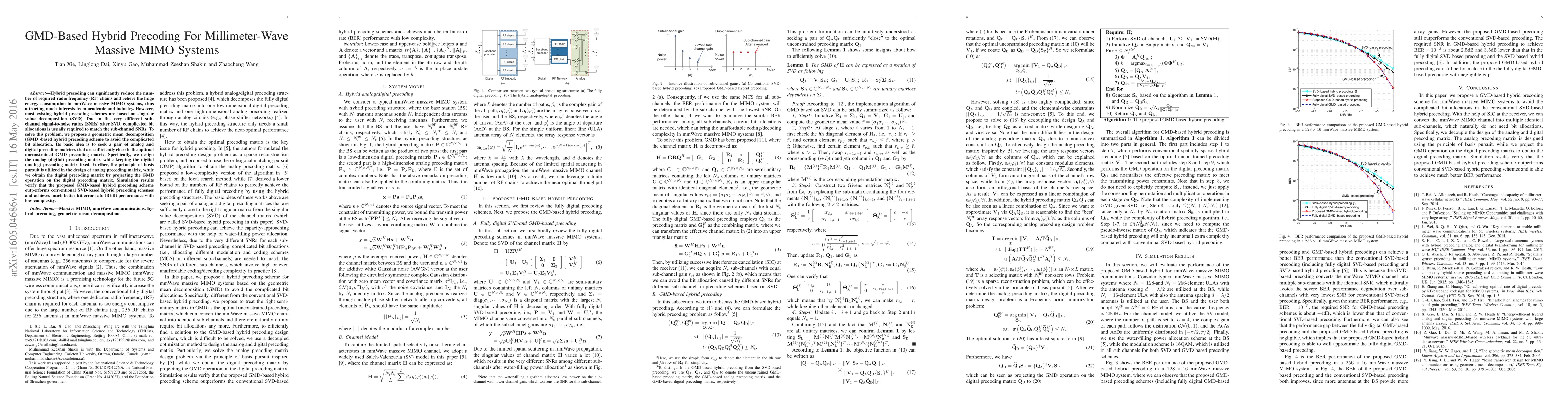 This paper proposes a GMD-based hybrid precoding scheme to improve millimeter-wave massive MIMO systems, reducing RF chains and energy consumption. The new method avoids complicated bit allocation by seeking analog and digital precoding matrices close to the optimal GMD precoding matrix, achieving better BER performance with lower complexity than SVD-based schemes.