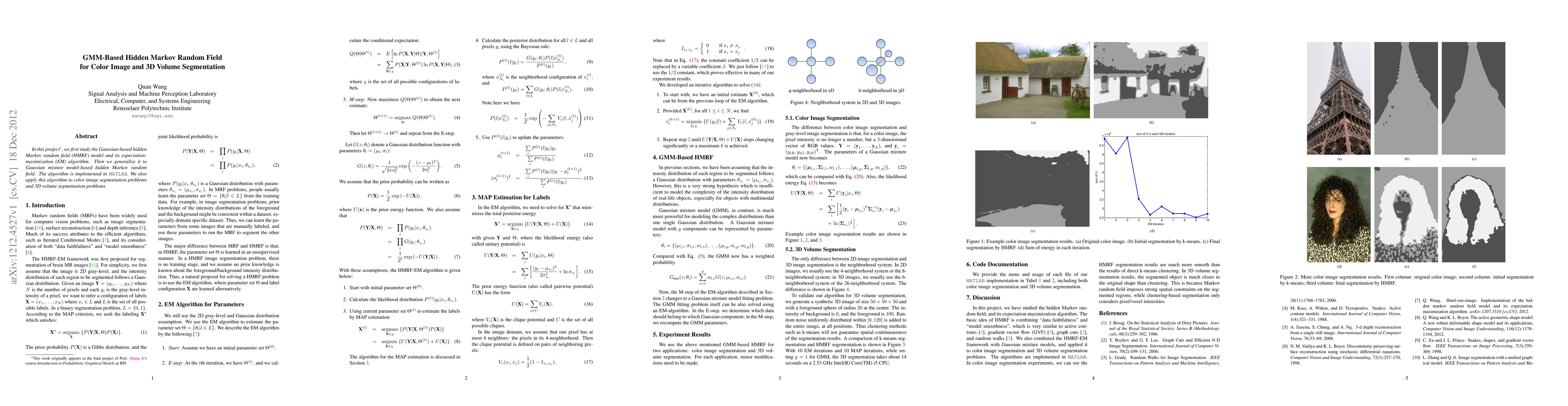 This paper develops a Gaussian mixture model-based hidden Markov random field (GMM-HMRF) for color image and 3D volume segmentation. It utilizes an expectation-maximization algorithm and is implemented in MATLAB for practical application.