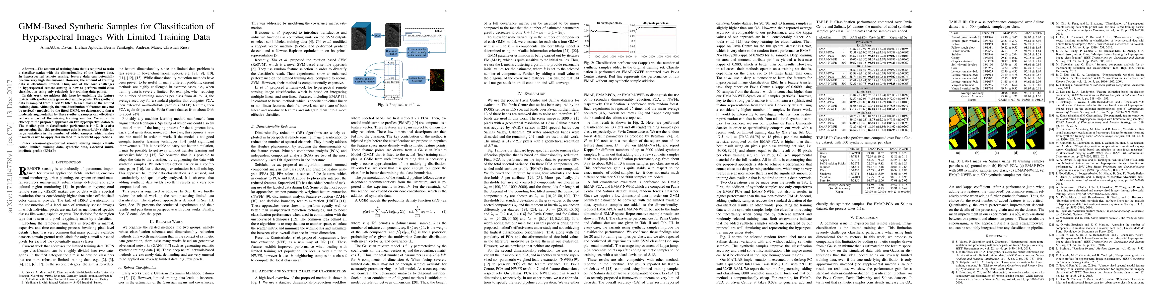 This paper proposes using synthetic samples generated from Gaussian Mixture Models (GMM) to augment limited training data for hyperspectral image classification. The synthetic data effectively improves classification performance by an average of 5%, demonstrating stable results across varying sample sizes.
