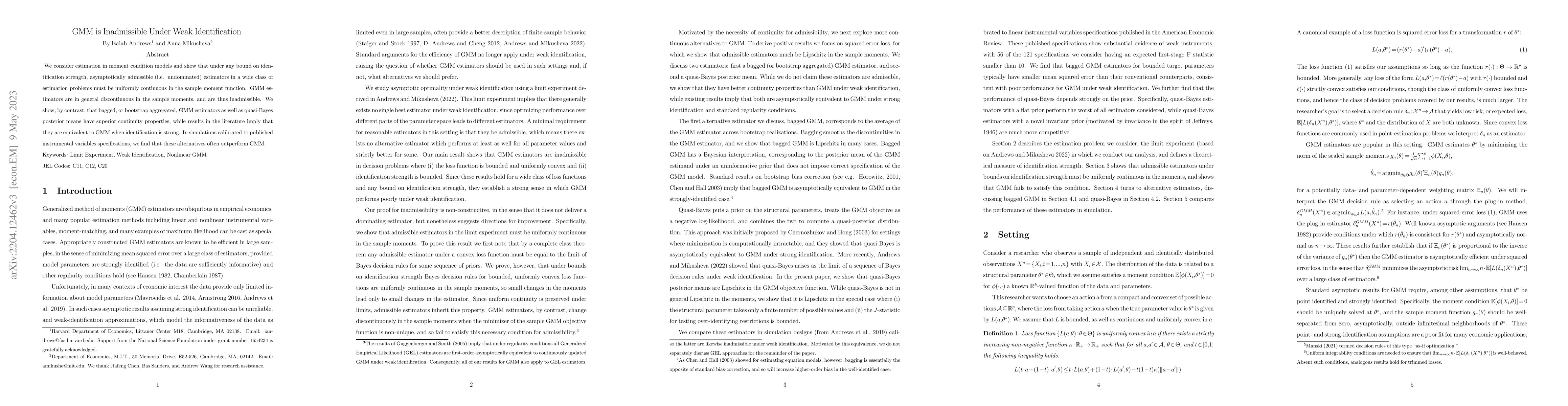 This paper demonstrates that Generalized Method of Moments (GMM) estimators are generally inadmissible under weak identification due to their discontinuity in sample moments, contrasting with uniformly continuous asymptotically admissible estimators. The study proposes bagged GMM and quasi-Bayes posterior means as alternatives that maintain superior continuity and often outperform GMM in simulations.