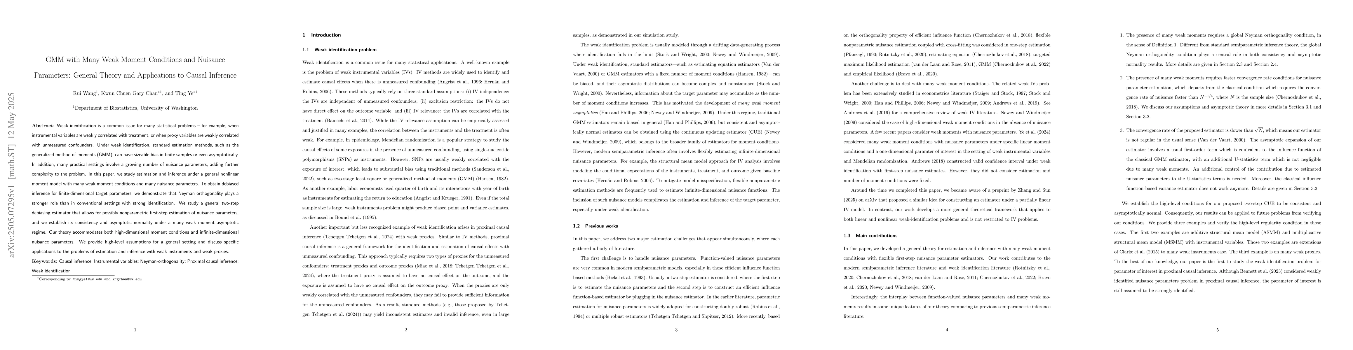 The paper studies estimation and inference under a general nonlinear moment model with many weak moment conditions and many nuisance parameters, employing a two-step debiasing estimator for finite-dimensional target parameters.