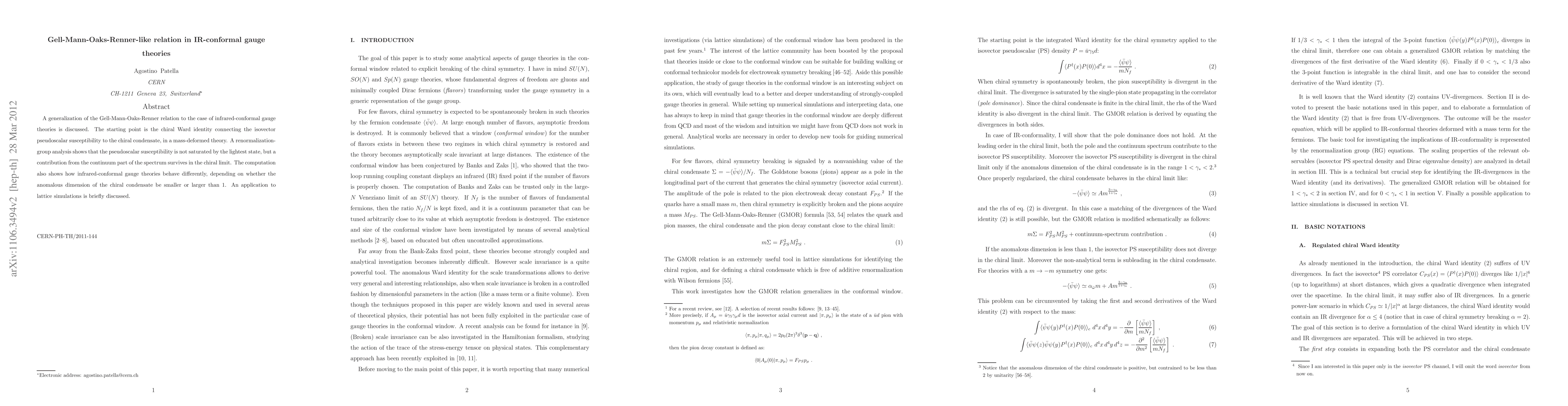 A generalization of the GMOR relation to the case of infrared-conformal gauge theories is discussed. The starting point is the chiral Ward identity connecting the isovector pseudoscalar susceptibility to the chiral condensate, in a mass-deformed theory. A renormalization-group analysis shows that the pseudoscalar susceptibility is not saturated by the lightest state, but a contribution from the continuum part of the spectrum survives in the chiral limit. The computation also shows how infrared-conformal gauge theories behave differently, depending on whether the anomalous dimension of the chiral condensate be smaller or larger than 1.