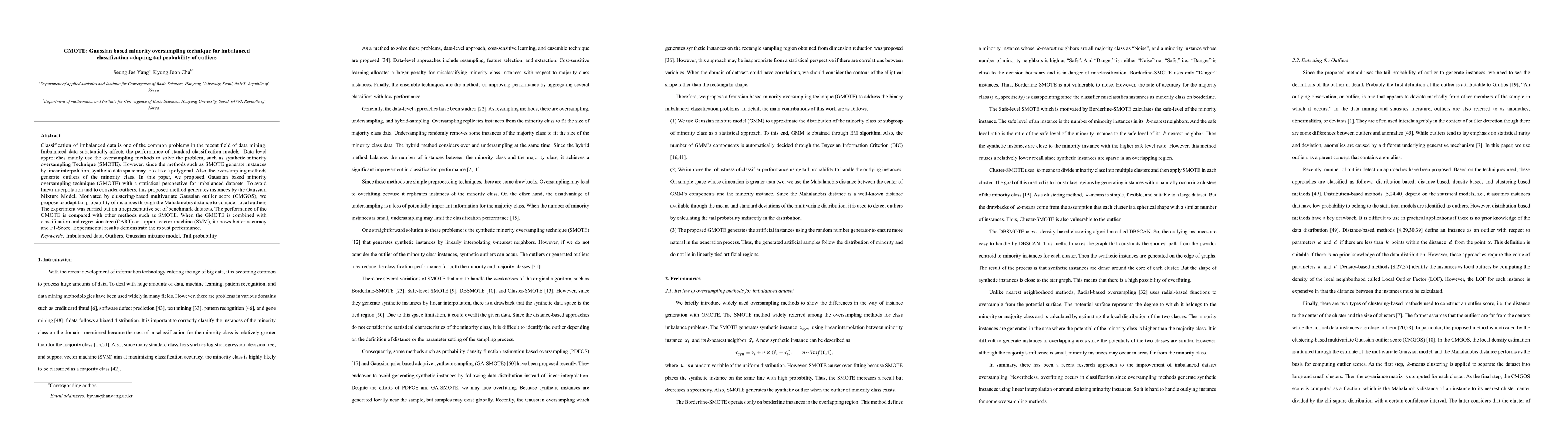 GMOTE is a Gaussian-based minority oversampling technique designed to address imbalanced classification problems by generating synthetic instances using a Gaussian Mixture Model, which avoids linear interpolation and better considers outliers. Experimental results show GMOTE combined with CART or SVM achieves higher accuracy and F1-Score compared to traditional methods like SMOTE.
