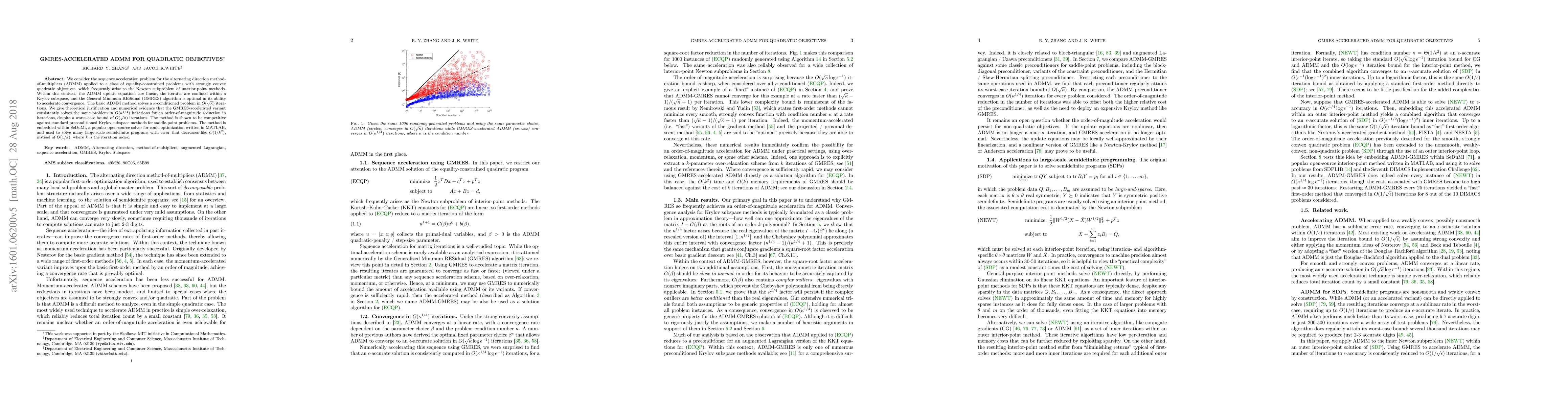 This paper proposes a GMRES-accelerated version of ADMM for solving strongly convex quadratic objectives, achieving a significant reduction in convergence iterations from $O(\sqrt{\kappa})$ to $O(\kappa^{1/4})$. The method is embedded in SeDuMi to solve large-scale semidefinite programs with improved error rates.