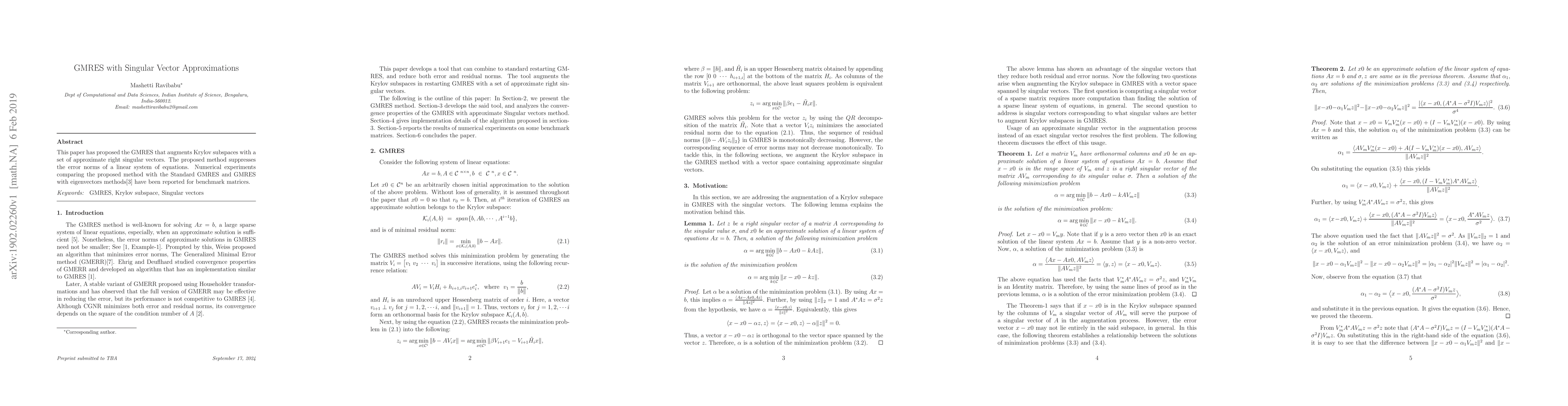 The paper proposes a modification to the GMRES method by augmenting Krylov subspaces with approximate right singular vectors, aiming to suppress error norms in solving linear systems.