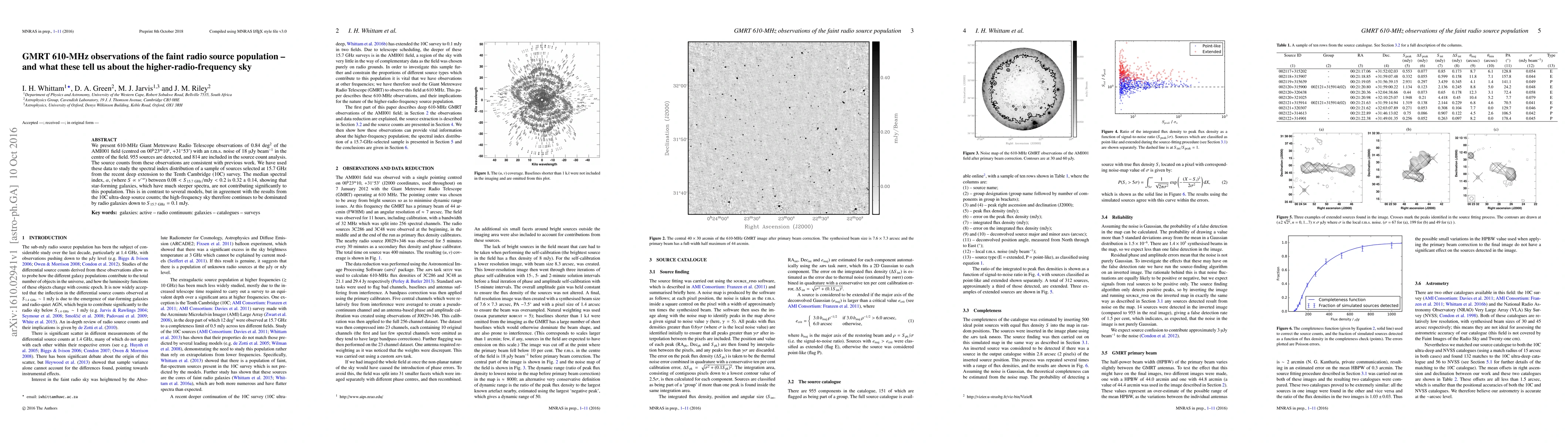 We present 610-MHz Giant Metrewave Radio Telescope observations of 0.84 deg$^2$ of the AMI001 field (centred on $00^{\rm h} 23^{\rm m} 10^{\rm s}$, $+31^{\circ} 53'$) with an r.m.s. noise of 18 $\mu$Jy beam$^{-1}$ in the centre of the field. 955 sources are detected, and 814 are included in the source count analysis. The source counts from these observations are consistent with previous work. We have used these data to study the spectral index distribution of a sample of sources selected at 15.7 GHz from the recent deep extension to the Tenth Cambridge (10C) survey. The median spectral index, $\alpha$, (where $S \propto \nu^{-\alpha}$) between $0.08 < S_{15.7~\rm GHz} / \rm mJy < 0.2$ is $0.32 \pm 0.14$, showing that star-forming galaxies, which have much steeper spectra, are not contributing significantly to this population. This is in contrast to several models, but in agreement with the results from the 10C ultra-deep source counts; the high-frequency sky therefore continues to be dominated by radio galaxies down to $S_{15.7~\rm GHz} = 0.1$ mJy.
