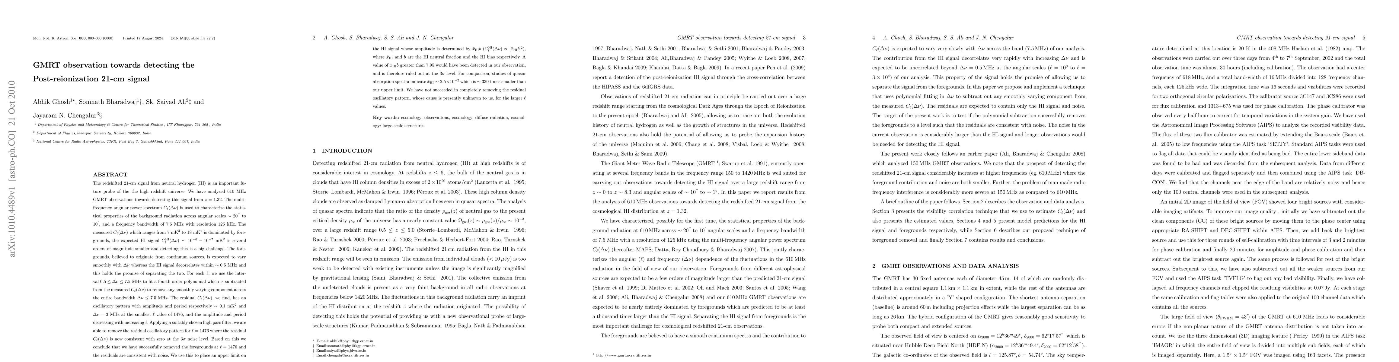 We have analyzed 610 MHz GMRT observations towards detecting the redshifted 21-cm signal from z=1.32. The multi-frequency angular power spectrum C_l(Delta nu) is used to characterize the statistical properties of the background radiation across angular scales ~20" to 10', and a frequency bandwidth of 7.5 MHz with resolution 125 kHz. The measured C_l(Delta nu) which ranges from 7 mK^2 to 18 mK^2 is dominated by foregrounds, the expected HI signal C_l^HI(Delta nu) ~10^{-6}- 10^{-7} mK^2 is several orders of magnitude smaller. The foregrounds, believed to originate from continuum sources, is expected to vary smoothly with Delta nu whereas the HI signal decorrelates within ~0.5 MHz and this holds the promise of separating the two. For each l, we use the interval 0.5 < Delta nu < 7.5 MHz to fit a fourth order polynomial which is subtracted from the measured C_l(Delta nu) to remove any smoothly varying component across the entire bandwidth Delta nu < 7.5 MHz. The residual C_l(Delta nu), we find, has an oscillatory pattern with amplitude and period respectively ~0.1 mK^2 and Delta nu = 3 MHz at the smallest l value of 1476, and the amplitude and period decreasing with increasing l. Applying a suitably chosen high pass filter, we are able to remove the residual oscillatory pattern for l=1476 where the residual C_l(Delta nu) is now consistent with zero at the 3-sigma noise level. We conclude that we have successfully removed the foregrounds at l=1476 and the residuals are consistent with noise. We use this to place an upper limit on the HI signal whose amplitude is determined by x_HI b where x_HI and b are the HI neutral fraction and the HI bias respectively. A value of x_HI b greater than 7.95 would have been detected in our observation, and is therefore ruled out at the 3-sigma level. (abridged)