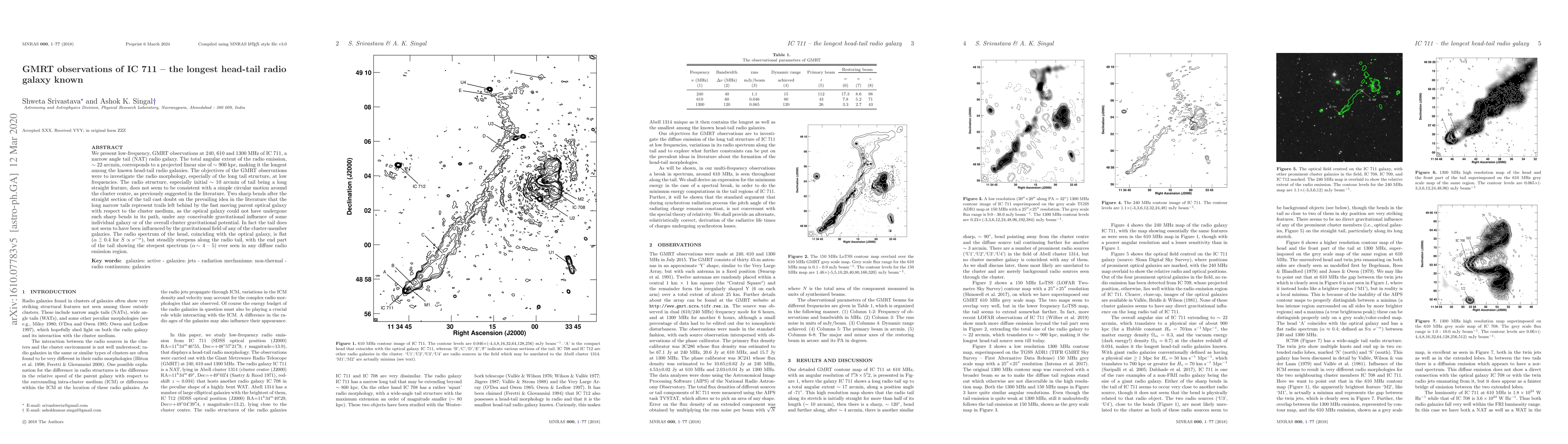 We present low-frequency, GMRT observations at 240, 610 and 1300 MHz of IC~711, a narrow angle tail (NAT) radio galaxy. The total angular extent of the radio emission, $\sim 22$ arcmin, corresponds to a projected linear size of $\sim 900$ kpc, making it the longest among the known head-tail radio galaxies. The objectives of the GMRT observations were to investigate the radio morphology, especially of the long tail structure, at low frequencies. The radio structure, especially initial $\sim 10$ arcmin of tail being a long straight feature, does not seem to be consistent with a simple circular motion around the cluster centre, as previously suggested in the literature. Two sharp bends after the straight section of the tail cast doubt on the prevailing idea in the literature that the long narrow tails represent trails left behind by the fast moving parent optical galaxy with respect to the cluster medium, as the optical galaxy could not have undergone such sharp bends in its path, under any conceivable gravitational influence of some individual galaxy or of the overall cluster gravitational potential. In fact the tail does not seem to have been influenced by the gravitational field of any of the cluster-member galaxies. The radio spectrum of the head, coinciding with the optical galaxy, is flat ($\alpha \stackrel{<}{_{\sim}}0.4$ for $S \propto \nu ^{-\alpha}$), but steadily steepens along the radio tail, with the end part of the tail showing the steepest spectrum ($\alpha \, {\sim}$ 4 -- 5) ever seen in any diffuse radio emission region.