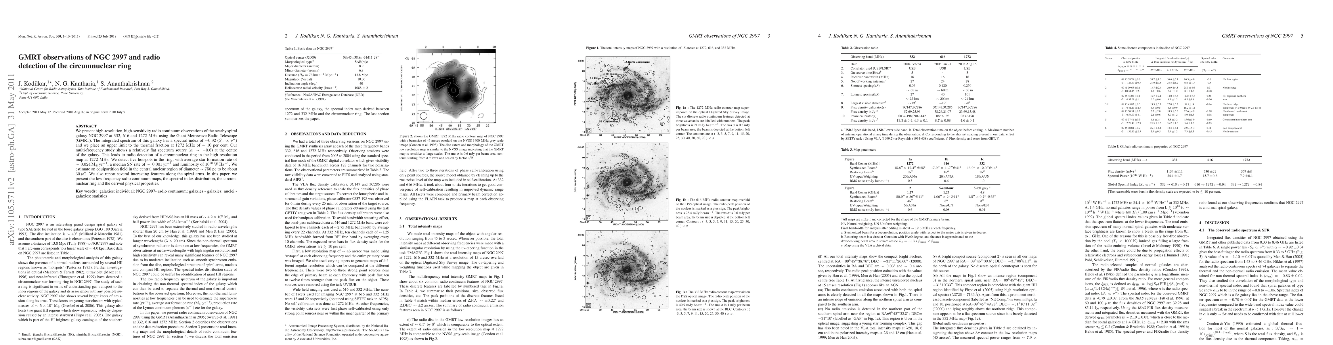 The study used GMRT to observe NGC 2997 at multiple radio frequencies, revealing a circumnuclear ring with five hotspots. The ring's star formation rate and supernova rate were estimated, and an equipartition magnetic field strength was determined for the central region.