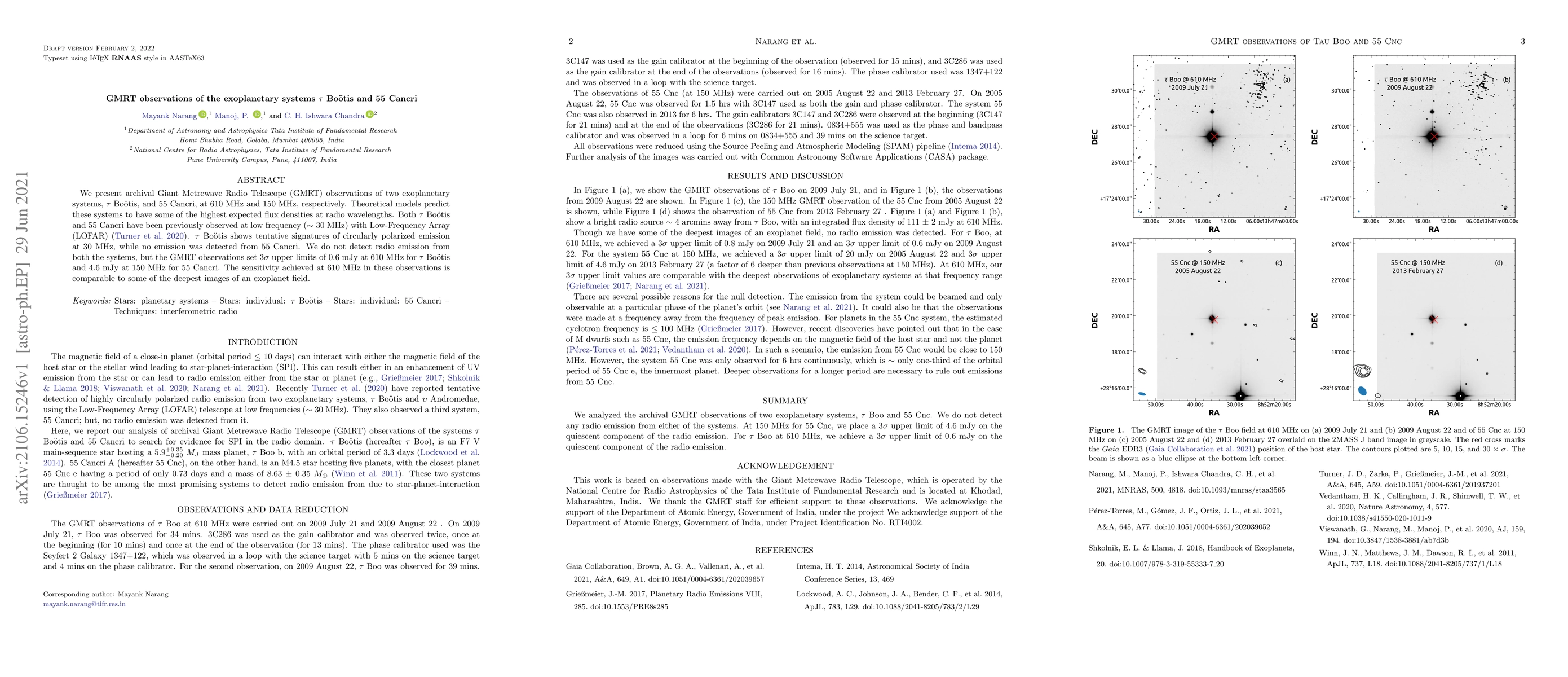 This paper reports on GMRT observations of the exoplanetary systems $\tau$ Bo\"otis and 55 Cancri at radio wavelengths, finding no detectable radio emission but setting new upper limits on their flux densities. The results contribute to understanding the potential for radio emissions from such systems.