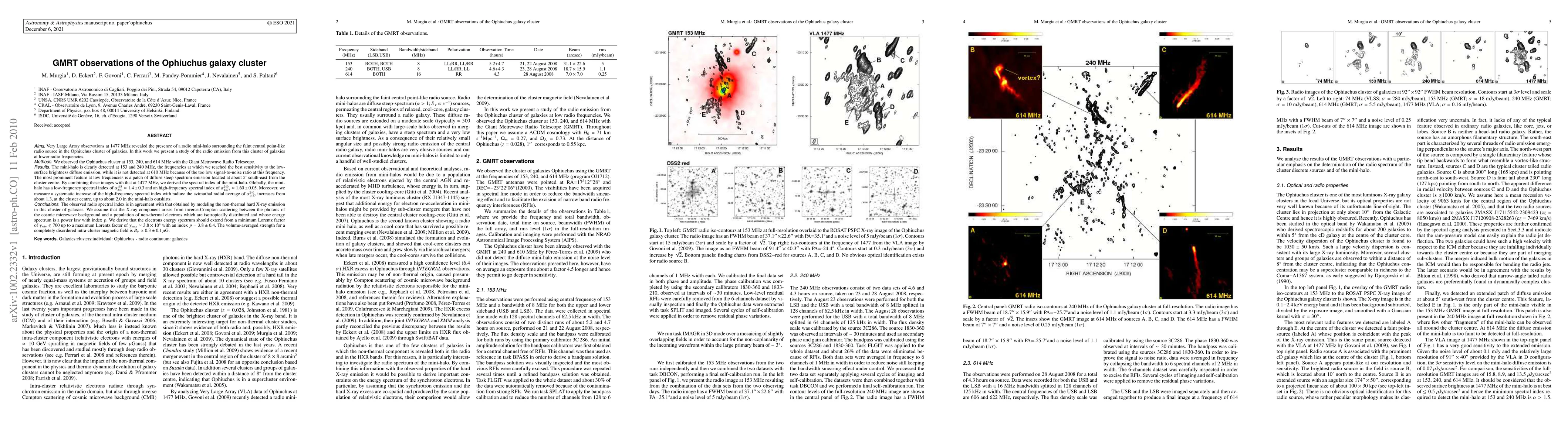 Researchers used the GMRT to study radio emission from the Ophiuchus galaxy cluster at different frequencies, detecting a mini-halo of radio emission that varies in spectral index with distance from the center.