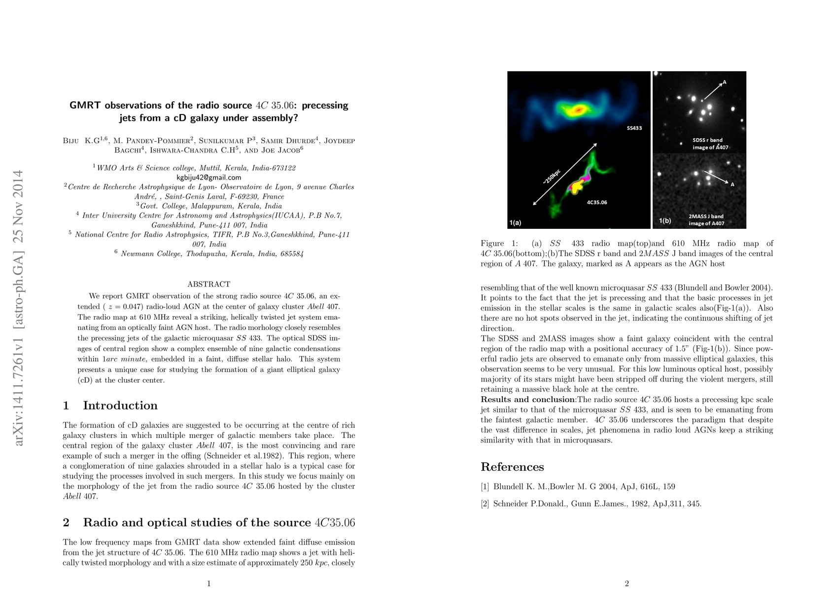 We report GMRT observation of the strong radio source 4C 35.06, an extended (z=0.047) radio-loud AGN at the center of galaxy cluster Abell 407. The radio map at 610 MHz reveal a striking, helically twisted jet system emanating from an optically faint AGN host. The radio morphology closely resembles the precessing jets of the galactic microquasar SS 433. The optical SDSS images of central region show a complex ensemble of nine galactic condensations within 1 arc minute, embedded in a faint, diffuse stellar halo. This system presents a unique case for studying the formation of a giant elliptical galaxy (cD) at the cluster center.