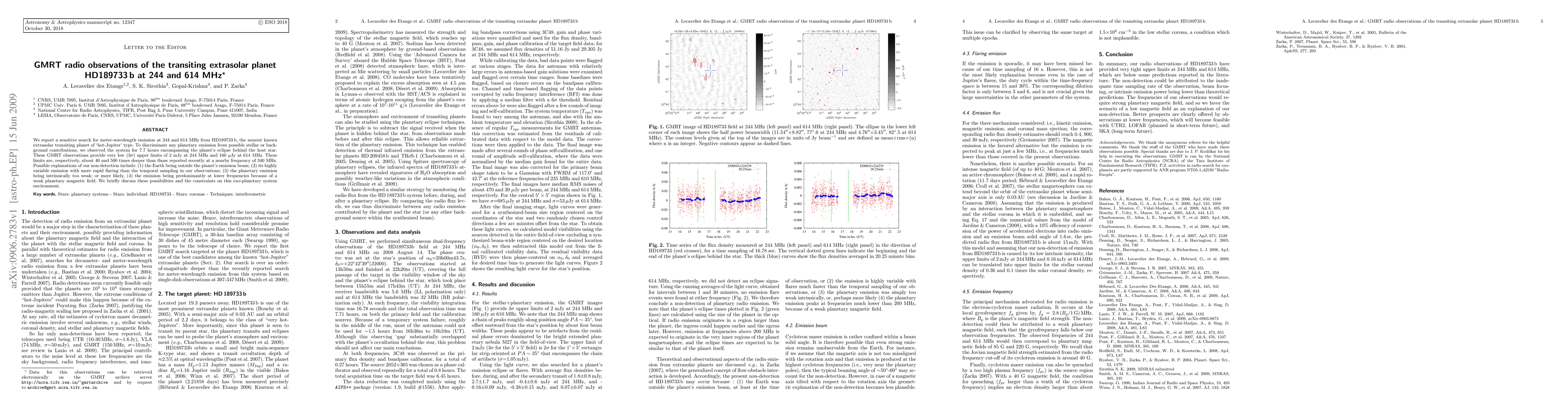 Researchers used radio telescopes to search for signals from the transiting extrasolar planet HD189733b, finding very low upper limits of no detectable emission at 244 MHz and 160 micro-Jy at 614 MHz.