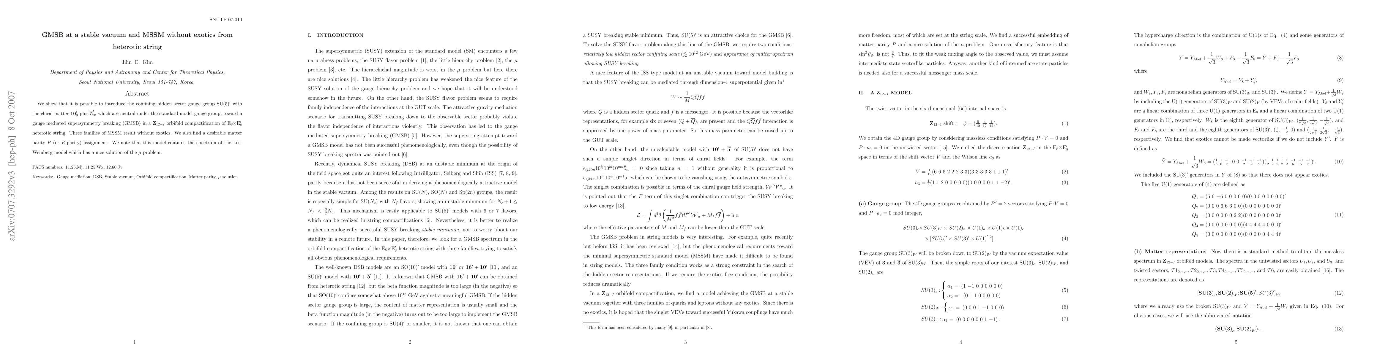 We show that it is possible to introduce the confining hidden sector gauge group SU(5)' with the chiral matter 10 plus 5-bar, which are neutral under the standard model gauge group, toward a gauge mediated supersymmetry breaking (GMSB) in a Z_{12-I} orbifold compactification of E_8xE_8 heterotic string. Three families of MSSM result without exotics. We also find a desirable matter parity P (or R-parity) assignment. We note that this model contains the spectrum of the Lee-Weinberg model which has a nice solution of the mu problem.