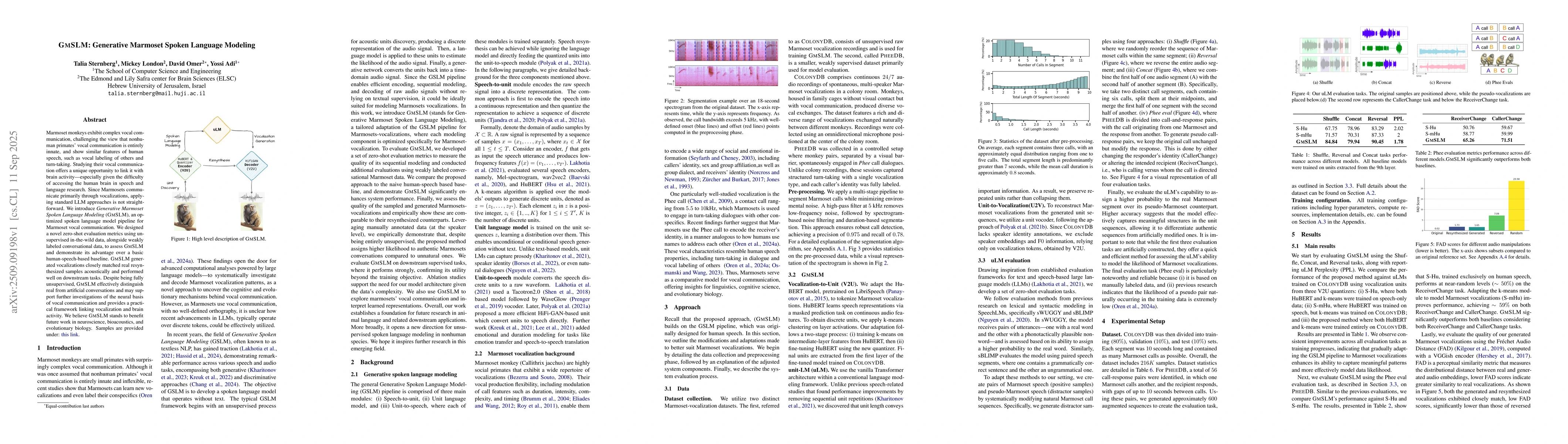 Marmoset monkeys exhibit complex vocal communication, challenging the view that nonhuman primates vocal communication is entirely innate, and show similar features of human speech, such as vocal labeling of others and turn-taking. Studying their vocal communication offers a unique opportunity to link it with brain activity-especially given the difficulty of accessing the human brain in speech and language research. Since Marmosets communicate primarily through vocalizations, applying standard LLM approaches is not straightforward. We introduce Generative Marmoset Spoken Language Modeling (GmSLM), an optimized spoken language model pipeline for Marmoset vocal communication. We designed a novel zero-shot evaluation metrics using unsupervised in-the-wild data, alongside weakly labeled conversational data, to assess GmSLM and demonstrate its advantage over a basic human-speech-based baseline. GmSLM generated vocalizations closely matched real resynthesized samples acoustically and performed well on downstream tasks. Despite being fully unsupervised, GmSLM effectively distinguish real from artificial conversations and may support further investigations of the neural basis of vocal communication and provides a practical framework linking vocalization and brain activity. We believe GmSLM stands to benefit future work in neuroscience, bioacoustics, and evolutionary biology. Samples are provided under: pages.cs.huji.ac.il/adiyoss-lab/GmSLM.