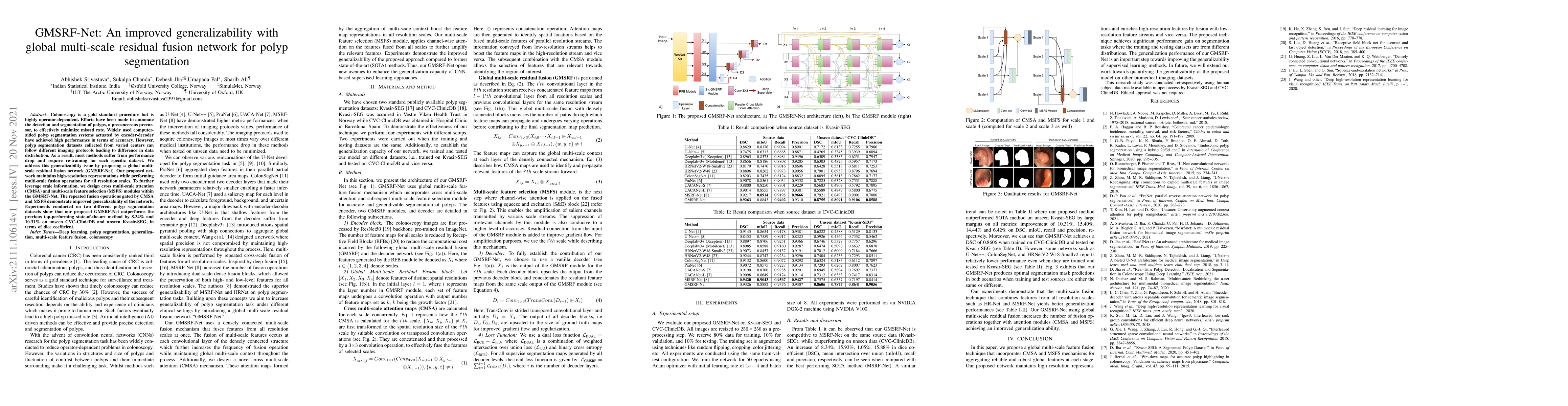 The paper proposes GMSRF-Net, a global multi-scale residual fusion network for polyp segmentation, which enhances generalizability across different datasets by integrating multi-scale fusion, cross multi-scale attention, and multi-scale feature selection. Experimental results show that GMSRF-Net outperforms previous methods, achieving significant improvements in dice coefficient on unseen datasets.