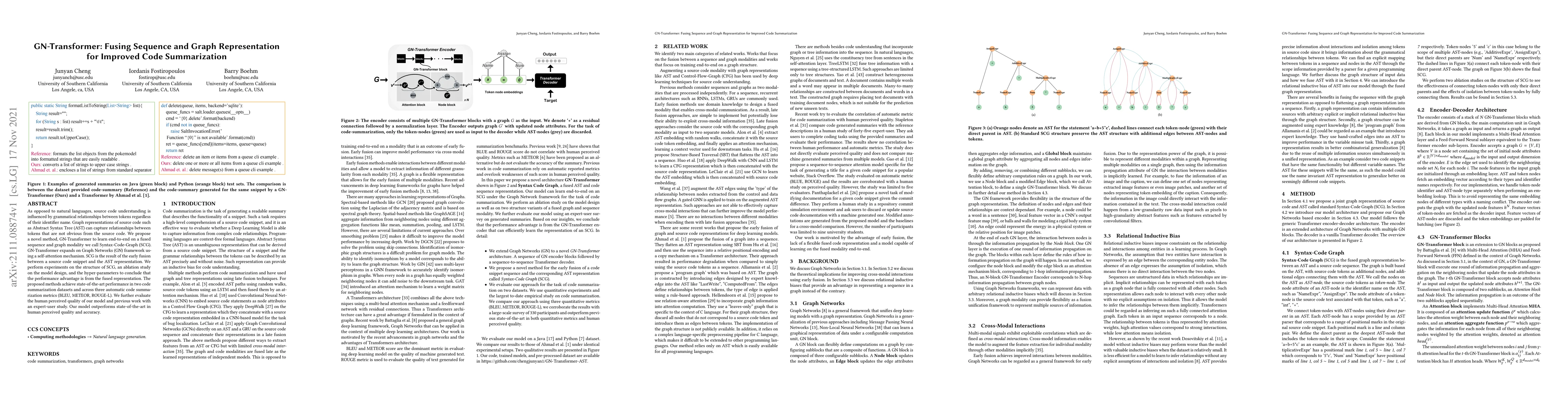 The GN-Transformer method fuses sequence and graph representations to enhance code summarization, achieving state-of-the-art performance on multiple metrics and outperforming previous models in human-perceived quality. The success is attributed to the novel Syntax-Code-Graph (SCG) representation that combines source code and Abstract Syntax Tree (AST) data.