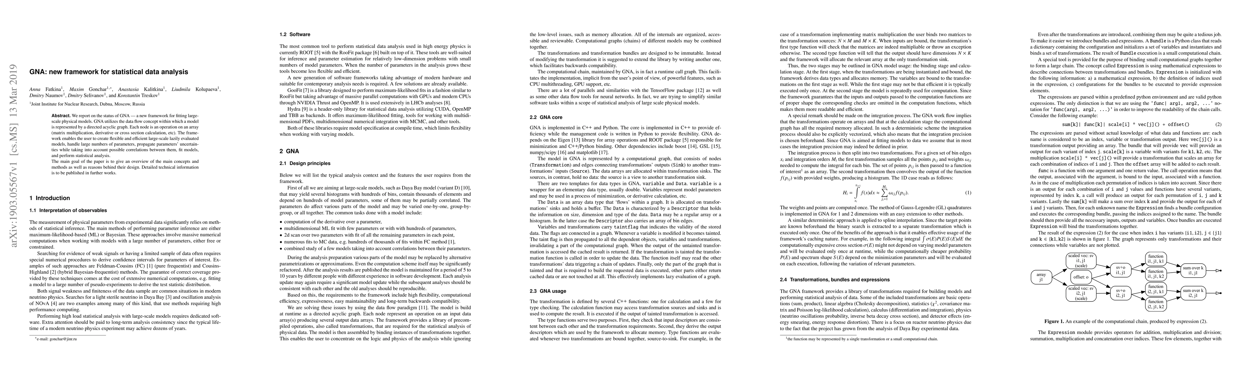 GNA is a novel framework for fitting large-scale physical models using a directed acyclic graph representation, enabling flexible and efficient, lazily evaluated models. The framework supports parameter uncertainty propagation, correlation handling, and statistical analysis, with detailed technical specifics to be published in future works.