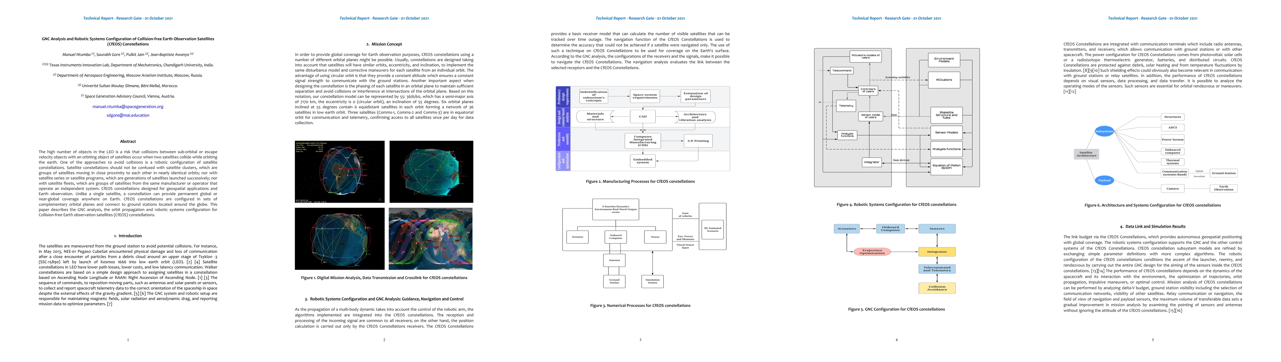 The high number of objects in the LEO is a risk that collisions between sub-orbital or escape velocity objects with an orbiting object of satellites occur when two satellites collide while orbiting the earth. One of the approaches to avoid collisions is a robotic configuration of satellite constellations. Satellite constellations should not be confused with satellite clusters, which are groups of satellites moving in close proximity to each other in nearly identical orbits; nor with satellite series or satellite programs, which are generations of satellites launched successively; nor with satellite fleets, which are groups of satellites from the same manufacturer or operator that operate an independent system. CfEOS constellations designed for geospatial applications and Earth observation. Unlike a single satellite, a constellation can provide permanent global or near-global coverage anywhere on Earth. CfEOS constellations are configured in sets of complementary orbital planes and connect to ground stations located around the globe. This paper describes the GNC analysis, the orbit propagation and robotic systems configuration for Collision-free Earth observation satellites (CfEOS) constellations.
