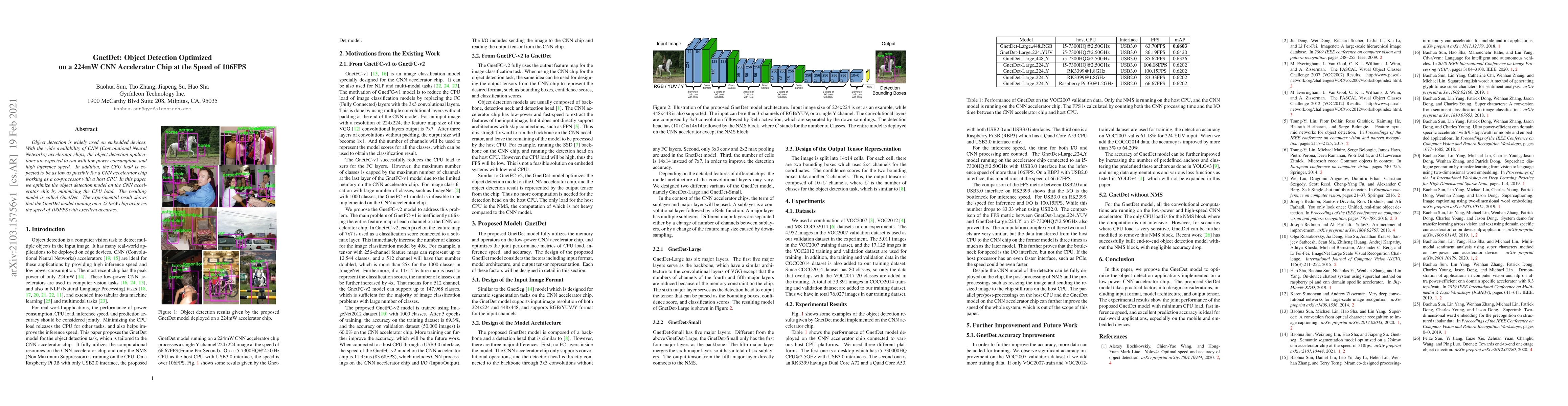 Object detection is widely used on embedded devices. With the wide availability of CNN (Convolutional Neural Networks) accelerator chips, the object detection applications are expected to run with low power consumption, and high inference speed. In addition, the CPU load is expected to be as low as possible for a CNN accelerator chip working as a co-processor with a host CPU. In this paper, we optimize the object detection model on the CNN accelerator chip by minimizing the CPU load. The resulting model is called GnetDet. The experimental result shows that the GnetDet model running on a 224mW chip achieves the speed of 106FPS with excellent accuracy.