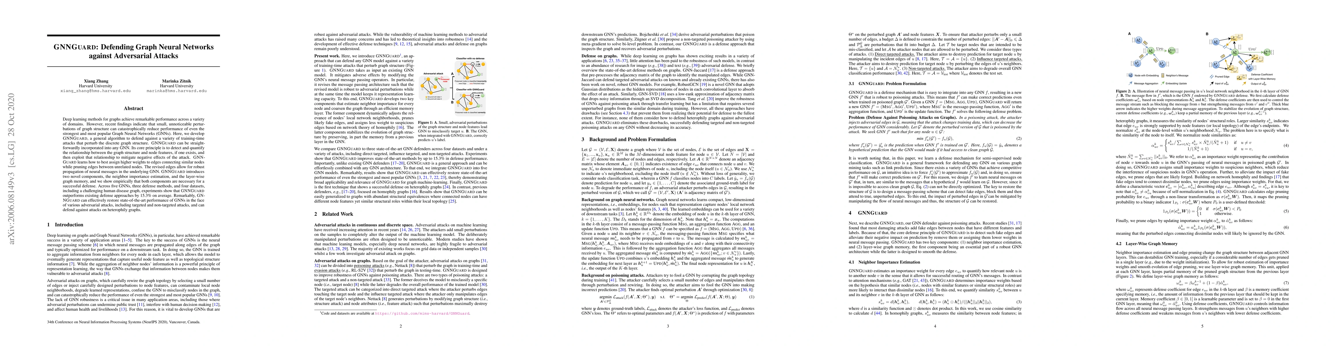GNNGuard introduces two novel components, neighbor importance estimation, and layer-wise graph memory, to detect and mitigate the negative effects of adversarial attacks on GNNs.