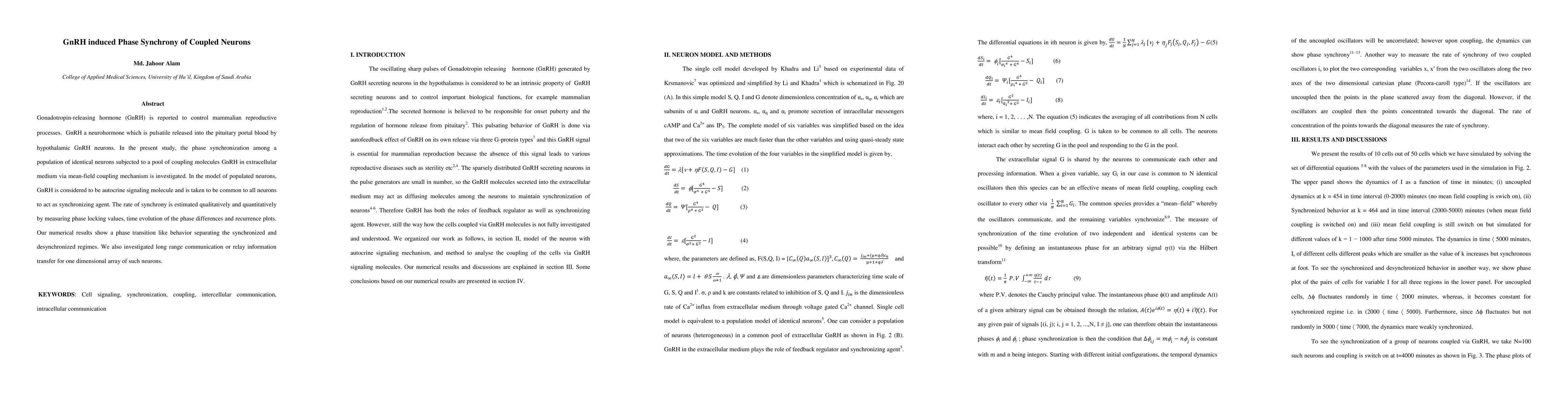 This study investigates how gonadotropin-releasing hormone (GnRH) induces phase synchronization among a population of coupled neurons through autocrine signaling. The research finds a phase transition behavior that separates synchronized and desynchronized regimes, demonstrating GnRH's role as a synchronizing agent.