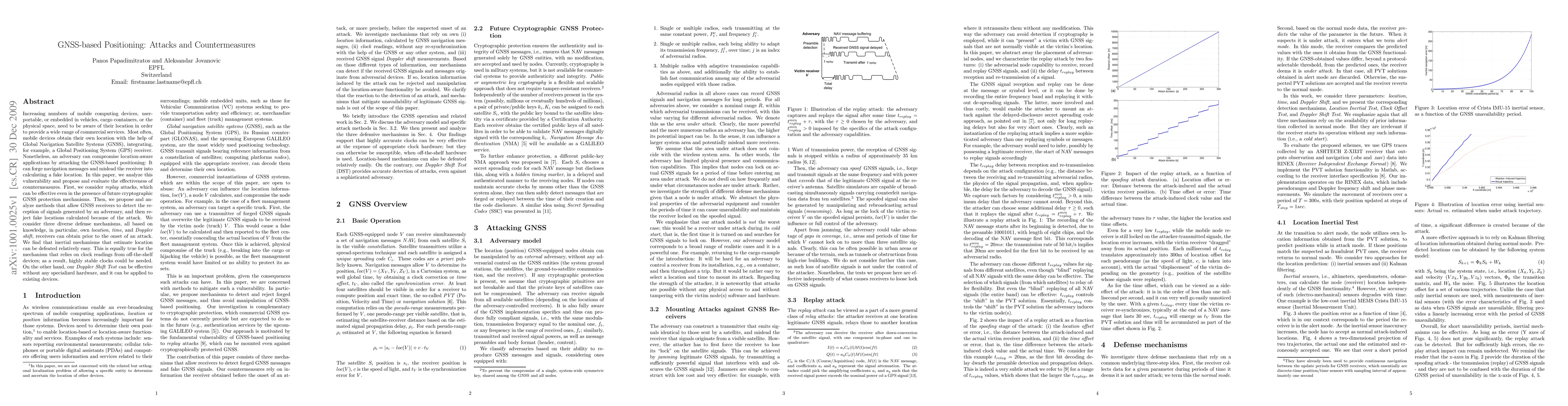 This paper examines vulnerabilities in GNSS-based positioning systems, particularly focusing on attacks like replay attacks that can mislead receivers into calculating fake locations. It proposes and evaluates countermeasures, including methods to detect adversarial signals and reject fake locations, finding that while inertial and clock-based defenses are easily defeated, a Doppler Shift Test can be an effective, hardware-independent defense.