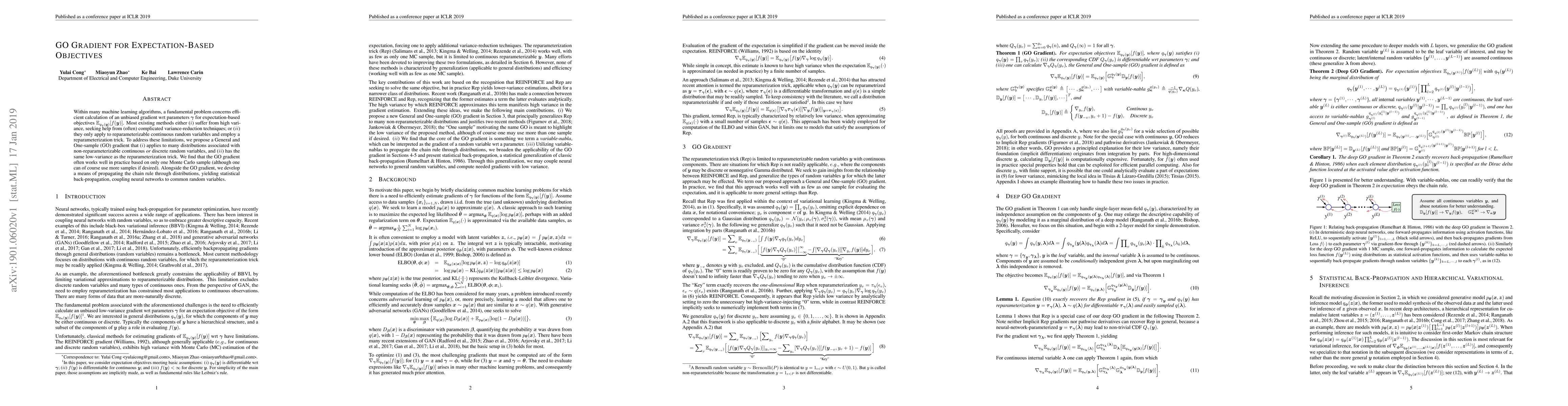 Within many machine learning algorithms, a fundamental problem concerns efficient calculation of an unbiased gradient wrt parameters $\gammav$ for expectation-based objectives $\Ebb_{q_{\gammav} (\yv)} [f(\yv)]$. Most existing methods either (i) suffer from high variance, seeking help from (often) complicated variance-reduction techniques; or (ii) they only apply to reparameterizable continuous random variables and employ a reparameterization trick. To address these limitations, we propose a General and One-sample (GO) gradient that (i) applies to many distributions associated with non-reparameterizable continuous or discrete random variables, and (ii) has the same low-variance as the reparameterization trick. We find that the GO gradient often works well in practice based on only one Monte Carlo sample (although one can of course use more samples if desired). Alongside the GO gradient, we develop a means of propagating the chain rule through distributions, yielding statistical back-propagation, coupling neural networks to common random variables.