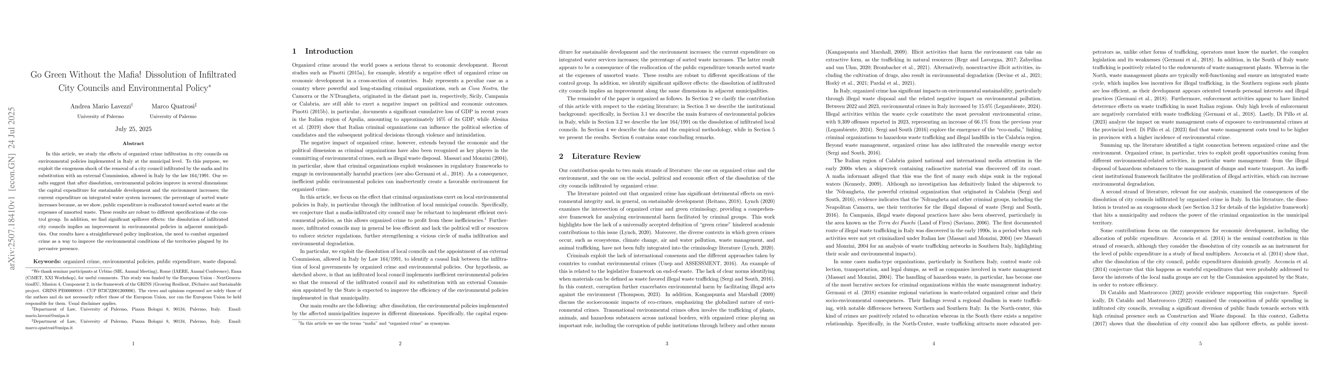 In this article, we study the effects of organized crime infiltration in city councils on environmental policies implemented in Italy at the municipal level. To this purpose, we exploit the exogenous shock of the removal of a city council infiltrated by the mafia and its substitution with an external Commission, allowed in Italy by the law 164/1991. Our results suggest that after dissolution, environmental policies improve in several dimensions: the capital expenditure for sustainable development and the environment increases; the current expenditure on integrated water system increases; the percentage of sorted waste increases because, as we show, public expenditure is reallocated toward sorted waste at the expenses of unsorted waste. These results are robust to different specifications of the control group. In addition, we find significant spillover effects: the dissolution of infiltrated city councils implies an improvement in environmental policies in adjacent municipalities. Our results have a straightforward policy implication, the need to combat organized crime as a way to improve the environmental conditions of the territories plagued by its pervasive presence.