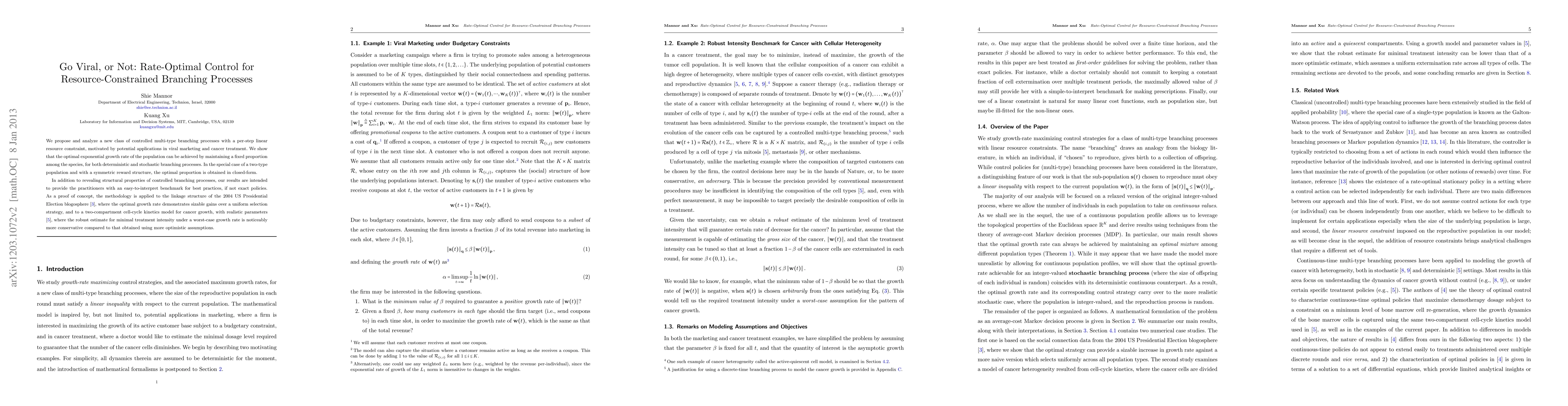 This paper proposes a controlled multi-type branching process model with a linear resource constraint, demonstrating optimal exponential growth rate through a fixed species proportion. The methodology is applied to viral marketing and cancer treatment, showing significant improvements over uniform selection strategies.