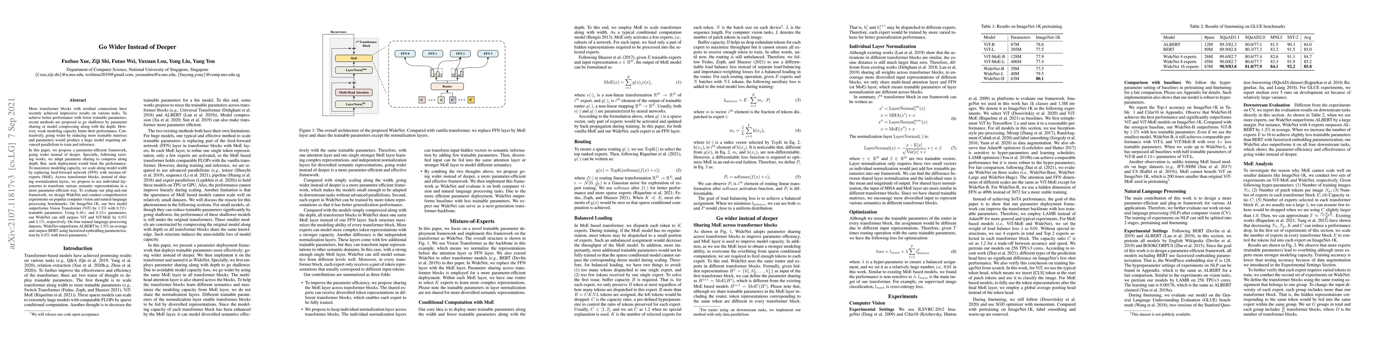 More transformer blocks with residual connections have recently achieved impressive results on various tasks. To achieve better performance with fewer trainable parameters, recent methods are proposed to go shallower by parameter sharing or model compressing along with the depth. However, weak modeling capacity limits their performance. Contrastively, going wider by inducing more trainable matrixes and parameters would produce a huge model requiring advanced parallelism to train and inference. In this paper, we propose a parameter-efficient framework, going wider instead of deeper. Specially, following existing works, we adapt parameter sharing to compress along depth. But, such deployment would limit the performance. To maximize modeling capacity, we scale along model width by replacing feed-forward network (FFN) with mixture-of-experts (MoE). Across transformer blocks, instead of sharing normalization layers, we propose to use individual layernorms to transform various semantic representations in a more parameter-efficient way. To evaluate our plug-and-run framework, we design WideNet and conduct comprehensive experiments on popular computer vision and natural language processing benchmarks. On ImageNet-1K, our best model outperforms Vision Transformer (ViT) by $1.5\%$ with $0.72 \times$ trainable parameters. Using $0.46 \times$ and $0.13 \times$ parameters, our WideNet can still surpass ViT and ViT-MoE by $0.8\%$ and $2.1\%$, respectively. On four natural language processing datasets, WideNet outperforms ALBERT by $1.8\%$ on average and surpass BERT using factorized embedding parameterization by $0.8\%$ with fewer parameters.
