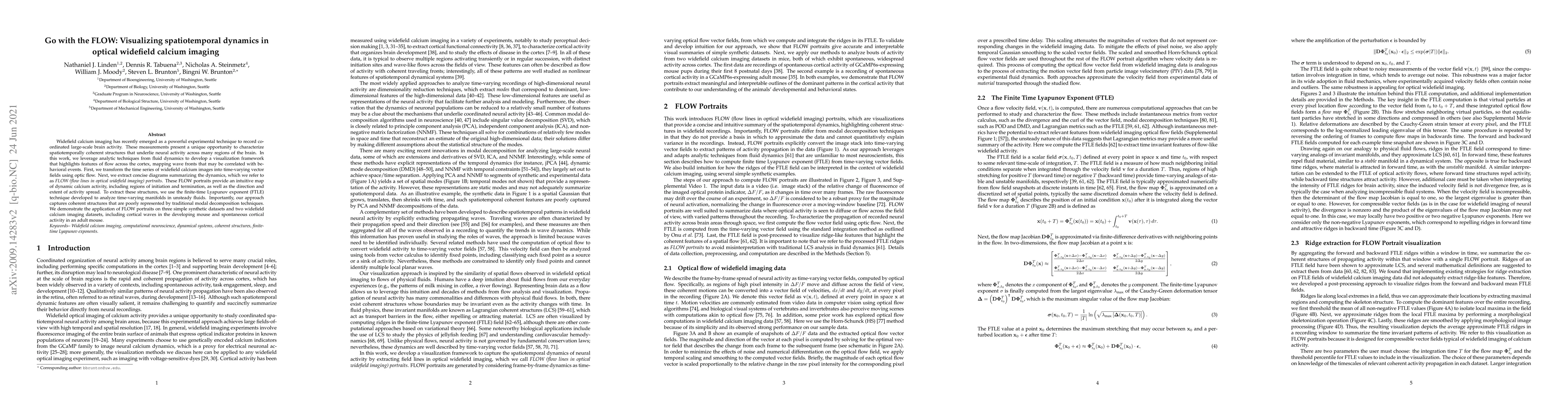 Widefield calcium imaging has recently emerged as a powerful experimental technique to record coordinated large-scale brain activity. These measurements present a unique opportunity to characterize spatiotemporal coherent structures that underlie neural activity across many regions of the brain. In this work, we leverage analytic techniques from fluid dynamics to develop a visualization framework that highlights features of flow across the cortex, mapping wave fronts that may be correlated with behavioral events. First, we transform the time series of widefield calcium images into time-varying vector fields using optic flow. Next, we extract concise diagrams summarizing the dynamics, which we refer to as FLOW (flow lines in optical widefield imaging) portraits. These FLOW portraits provide an intuitive map of dynamic calcium activity, including regions of initiation and termination, as well as the direction and extent of activity spread. To extract these structures, we use the finite-time Lyapunov exponent (FTLE) technique developed to analyze time-varying manifolds in unsteady fluids. Importantly, our approach captures coherent structures that are poorly represented by traditional modal decomposition techniques. We demonstrate the application of FLOW portraits on three simple synthetic datasets and two widefield calcium imaging datasets, including cortical waves in the developing mouse and spontaneous cortical activity in an adult mouse.