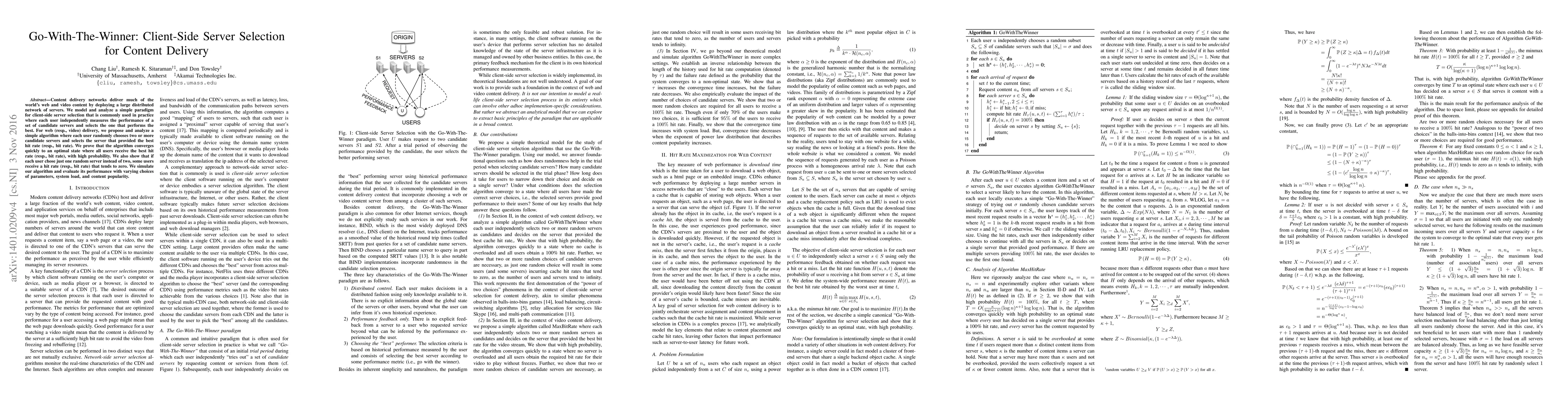 This paper proposes a client-side server selection algorithm for content delivery networks where users randomly choose multiple candidate servers and select the best performer based on hit rate or bit rate. The algorithm is shown to quickly converge to an optimal state, with simulations demonstrating its effectiveness under varying conditions.