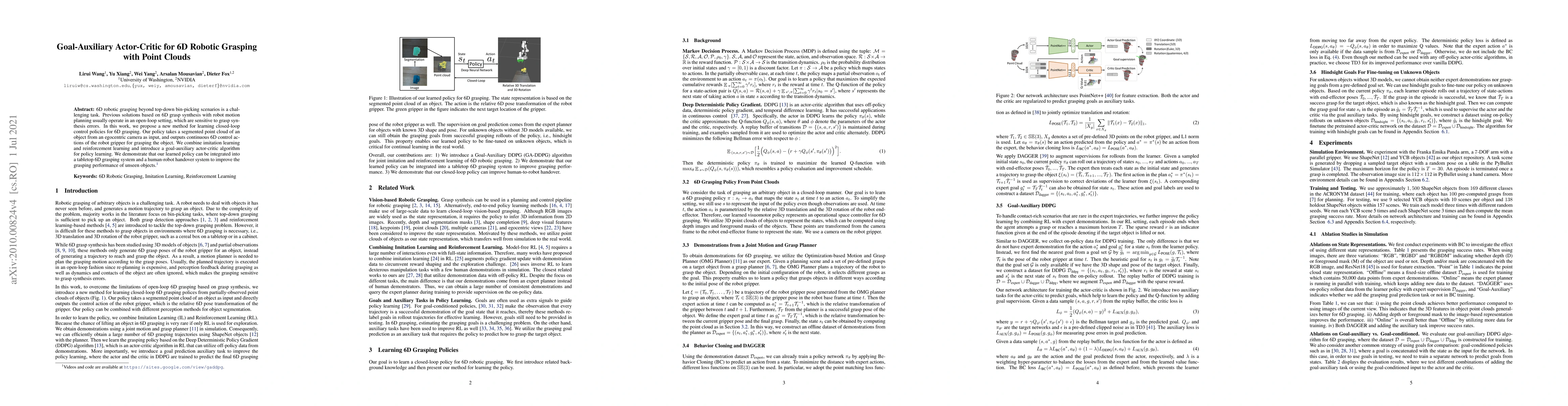 This paper proposes a goal-auxiliary actor-critic method for learning closed-loop control policies for 6D robotic grasping using point clouds. The method combines imitation and reinforcement learning to improve grasping performance for unseen objects in both tabletop and human-robot handover scenarios.