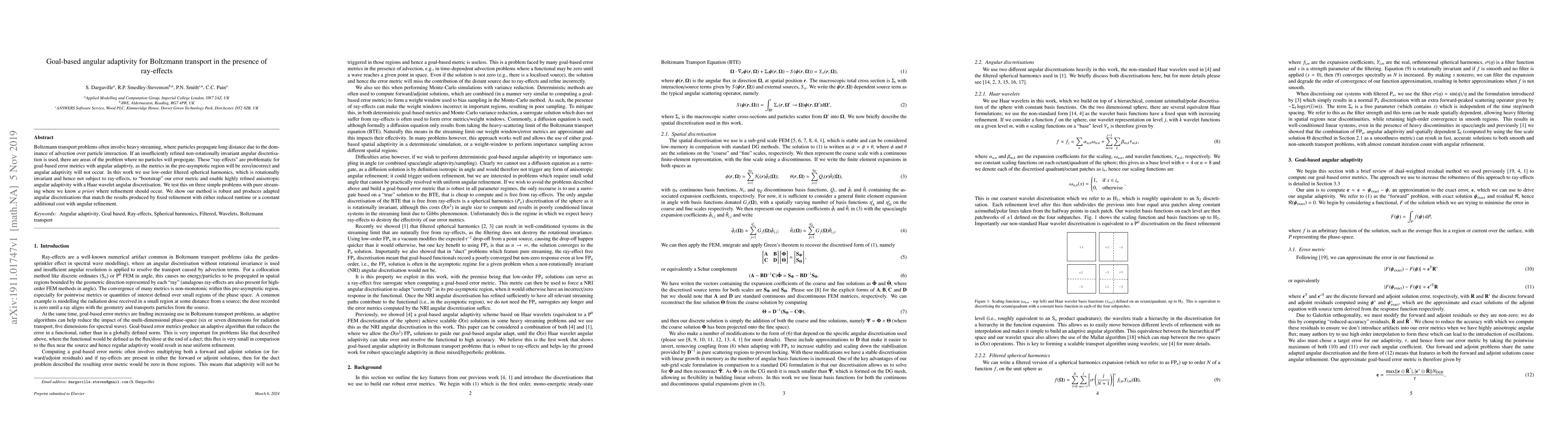 This paper proposes a method to address "ray-effects" in Boltzmann transport problems by using low-order filtered spherical harmonics for angular discretization, enabling robust goal-based angular adaptivity. The method demonstrates improved refinement in regions of pure streaming, achieving comparable results to fixed refinement with either reduced runtime or consistent additional cost.