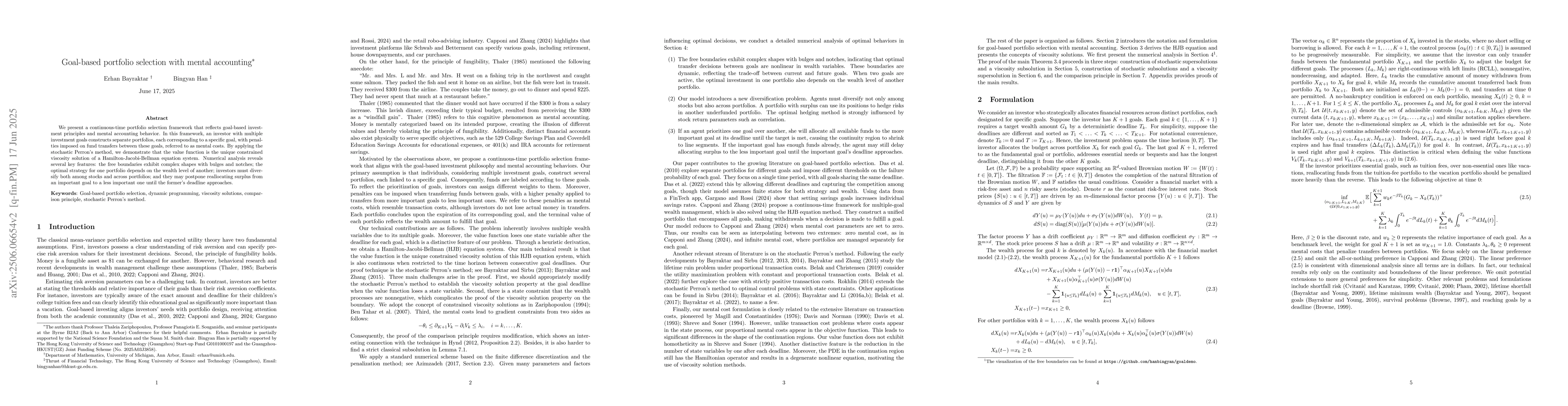 We present a continuous-time portfolio selection framework that reflects goal-based investment principles and mental accounting behavior. In this framework, an investor with multiple investment goals constructs separate portfolios, each corresponding to a specific goal, with penalties imposed on fund transfers between these goals, referred to as mental costs. By applying the stochastic Perron's method, we demonstrate that the value function is the unique constrained viscosity solution of a Hamilton-Jacobi-Bellman equation system. Numerical analysis reveals several key features: the free boundaries exhibit complex shapes with bulges and notches; the optimal strategy for one portfolio depends on the wealth level of another; investors must diversify both among stocks and across portfolios; and they may postpone reallocating surplus from an important goal to a less important one until the former's deadline approaches.