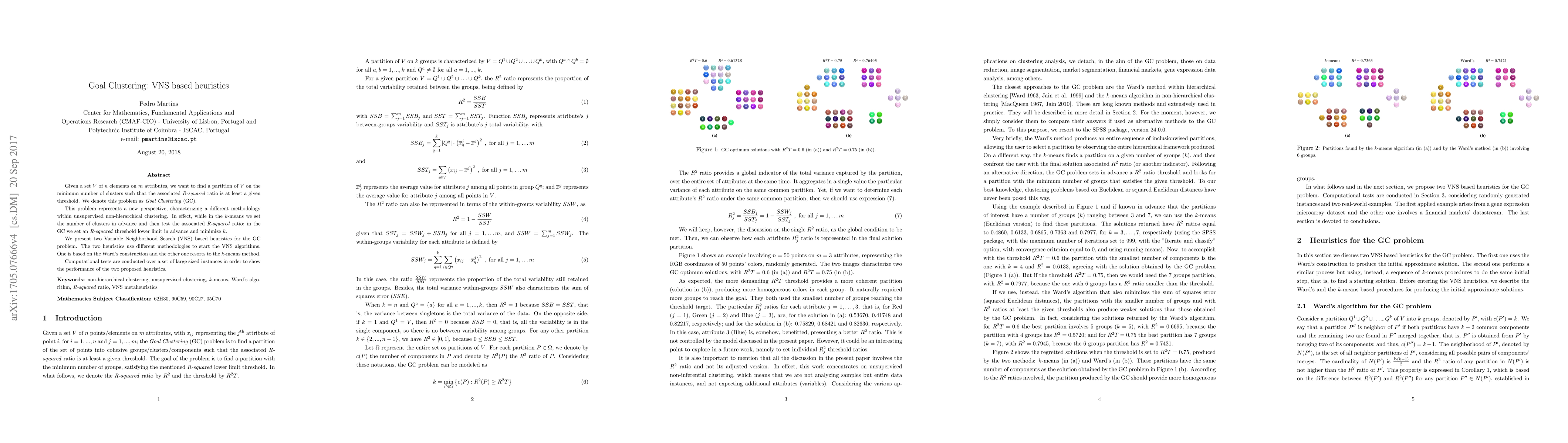 Given a set V of n elements on m attributes, we want to find a partition of V on the minimum number of clusters such that the associated R-squared ratio is at least a given threshold. We denote this problem as Goal Clustering (GC). This problem represents a new perspective, characterizing a different methodology within unsupervised non-hierarchical clustering. In effect, while in the k-means we set the number of clusters in advance and then test the associated R-squared ratio; in the GC we set an R-squared threshold lower limit in advance and minimize k. We present two Variable Neighborhood Search (VNS) based heuristics for the GC problem. The two heuristics use different methodologies to start the VNS algorithms. One is based on the Ward's construction and the other one resorts to the k-means method. Computational tests are conducted over a set of large sized instances in order to show the performance of the two proposed heuristics.