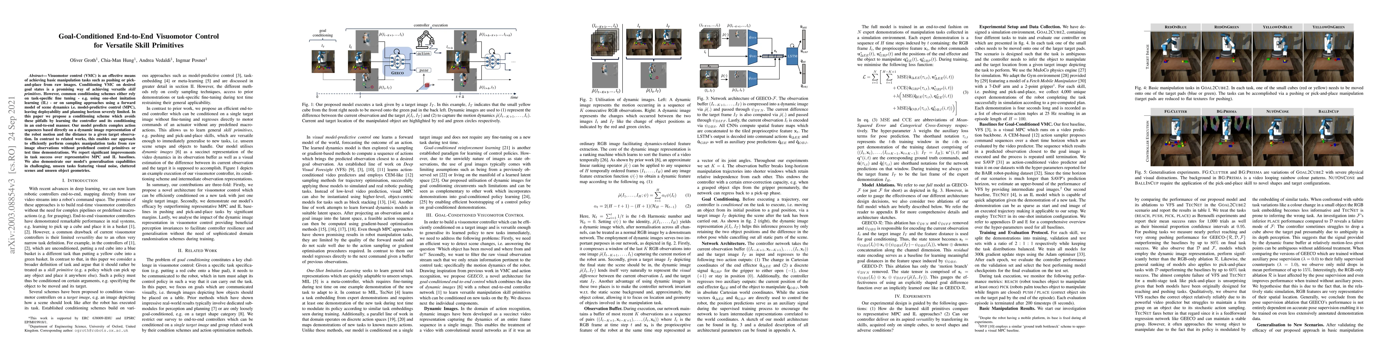 Visuomotor control (VMC) is an effective means of achieving basic manipulation tasks such as pushing or pick-and-place from raw images. Conditioning VMC on desired goal states is a promising way of achieving versatile skill primitives. However, common conditioning schemes either rely on task-specific fine tuning - e.g. using one-shot imitation learning (IL) - or on sampling approaches using a forward model of scene dynamics i.e. model-predictive control (MPC), leaving deployability and planning horizon severely limited. In this paper we propose a conditioning scheme which avoids these pitfalls by learning the controller and its conditioning in an end-to-end manner. Our model predicts complex action sequences based directly on a dynamic image representation of the robot motion and the distance to a given target observation. In contrast to related works, this enables our approach to efficiently perform complex manipulation tasks from raw image observations without predefined control primitives or test time demonstrations. We report significant improvements in task success over representative MPC and IL baselines. We also demonstrate our model's generalisation capabilities in challenging, unseen tasks featuring visual noise, cluttered scenes and unseen object geometries.
