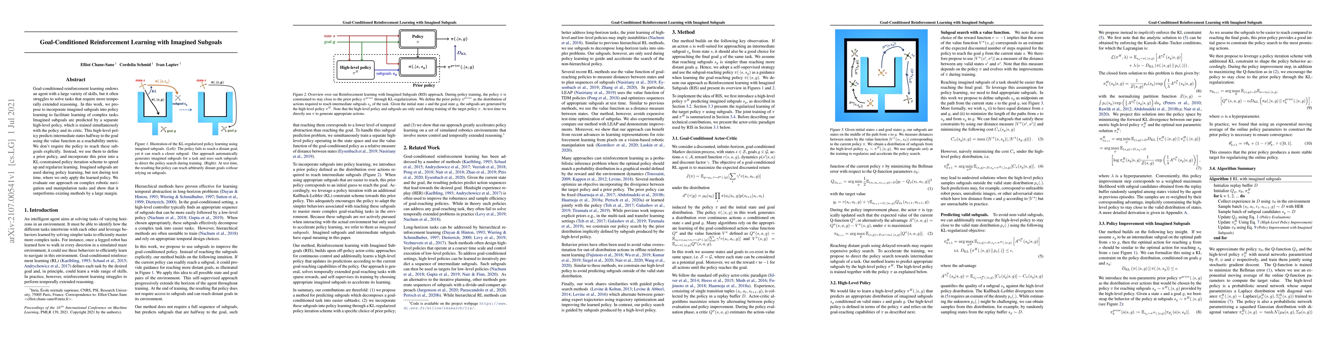 This paper proposes a method for goal-conditioned reinforcement learning that incorporates imagined subgoals to enhance learning of complex tasks. The approach uses a high-level policy to predict intermediate states, which are used to regularize the main policy through a KL-constrained policy iteration scheme, leading to improved performance on robotic navigation and manipulation tasks.