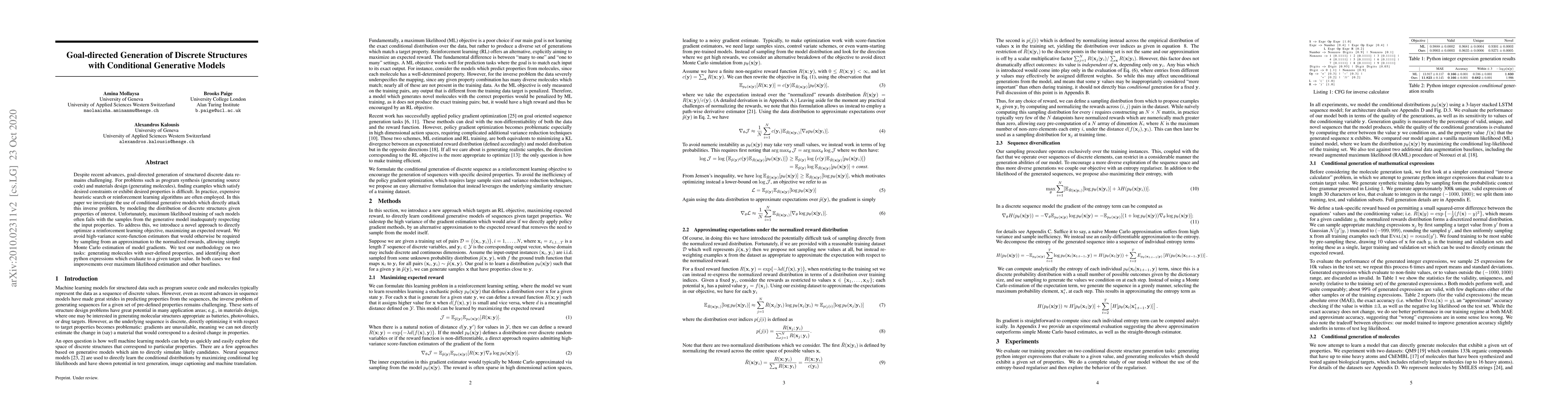 This paper proposes a novel reinforcement learning approach to optimize conditional generative models for generating discrete structures like molecules and source code that meet specific properties. The method improves upon maximum likelihood training by directly maximizing expected rewards, demonstrating better performance in tasks like materials design and program synthesis.