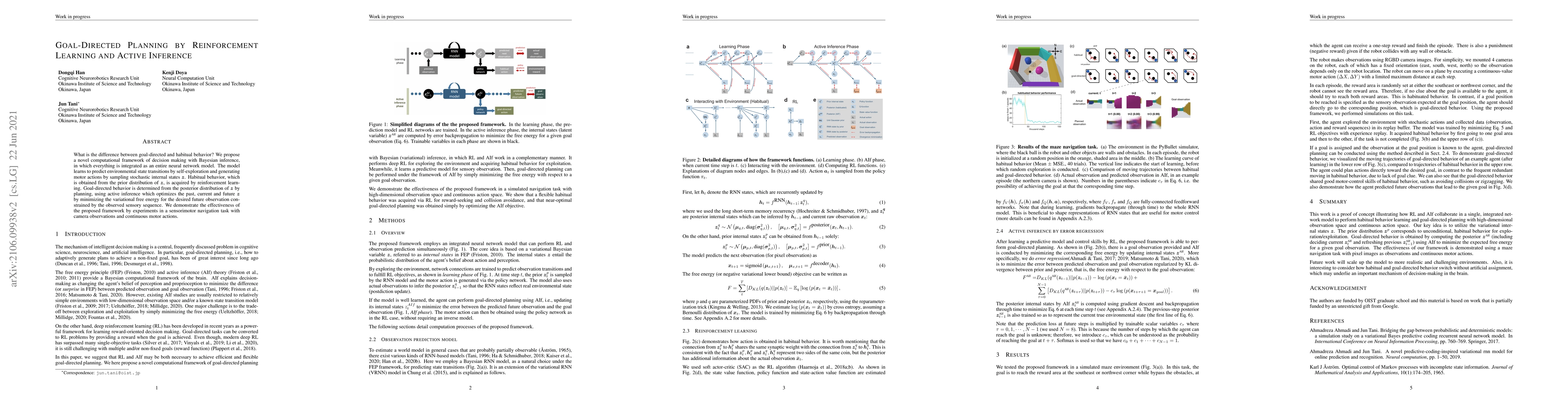 This paper proposes a novel computational framework for goal-directed planning using reinforcement learning and active inference, distinguishing between habitual and goal-directed behaviors. The model integrates Bayesian inference and self-exploration to optimize actions based on predicted state transitions, demonstrating its effectiveness through sensorimotor navigation tasks.