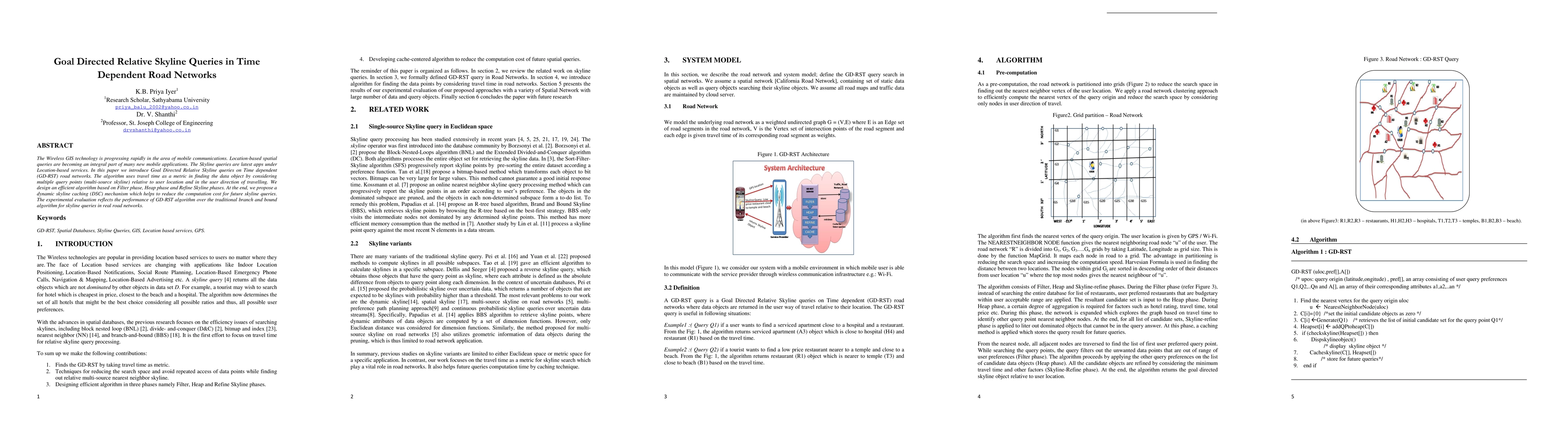 This paper introduces Goal Directed Relative Skyline Queries (GD-RST) for time-dependent road networks, employing travel time metrics to find optimal data objects from multiple query points. The proposed algorithm includes Filter, Heap, and Refine phases, and introduces a dynamic skyline caching mechanism to reduce computation costs for future queries, demonstrating better performance than traditional methods.