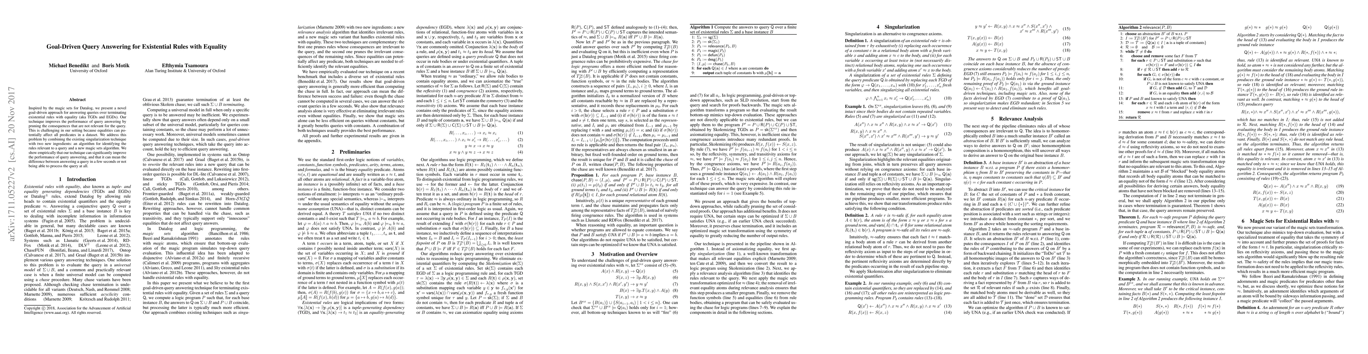 This paper introduces a goal-driven query answering technique for existential rules with equality, combining singularization with new algorithms to identify relevant rules and an enhanced magic sets method. This approach significantly enhances query answering performance by pruning irrelevant consequences.